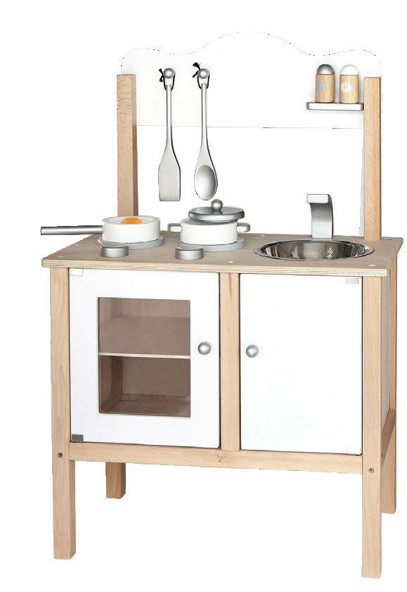 This beautifully natural and white countertop kitchen unit encourages imaginative play. The counter contains a basin with water spout & 2 stove plates with on-off knobs. Under-counter cupboard & cabinet provide plenty of storage space. Assorted accessories include 1 spatula, 1 cooking spoon, 1 saucepan with lid, 1 frying pan with egg & 2 seasoning jars. Age 3+. Key