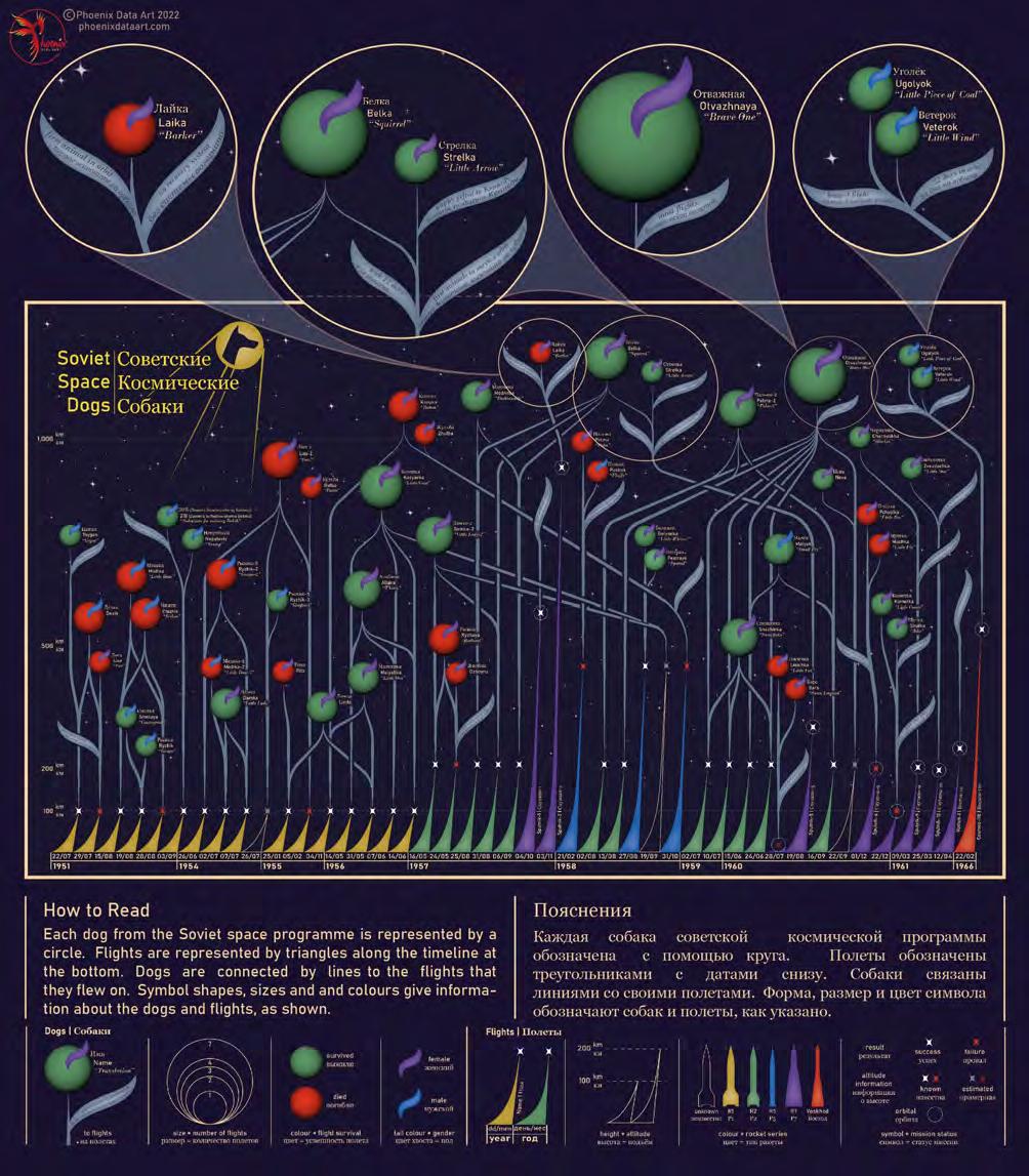 If you want to know more about the Soviet Space Dogs data visualisation project, the book that inspired it or the charity it supports, visit phoenixdataart.com. Prints and products are available at phoenixdataart.redbubble.com all profits go to Shelter Friend, rescuing abandoned dogs in Ukraine.