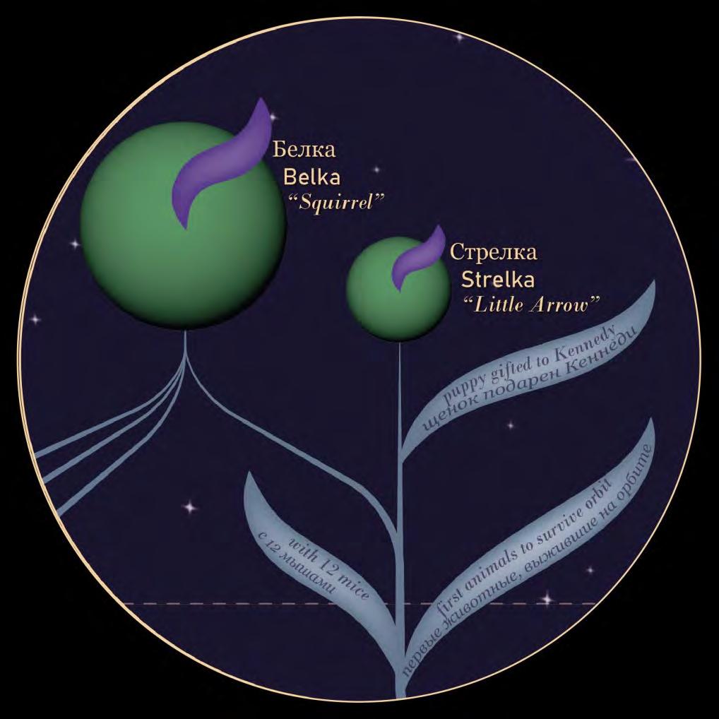and shapes used came from the book itself, which contains many images of Soviet artefacts, from postcards to book covers, cigarette packets and sweet tins, which featured the space dogs.