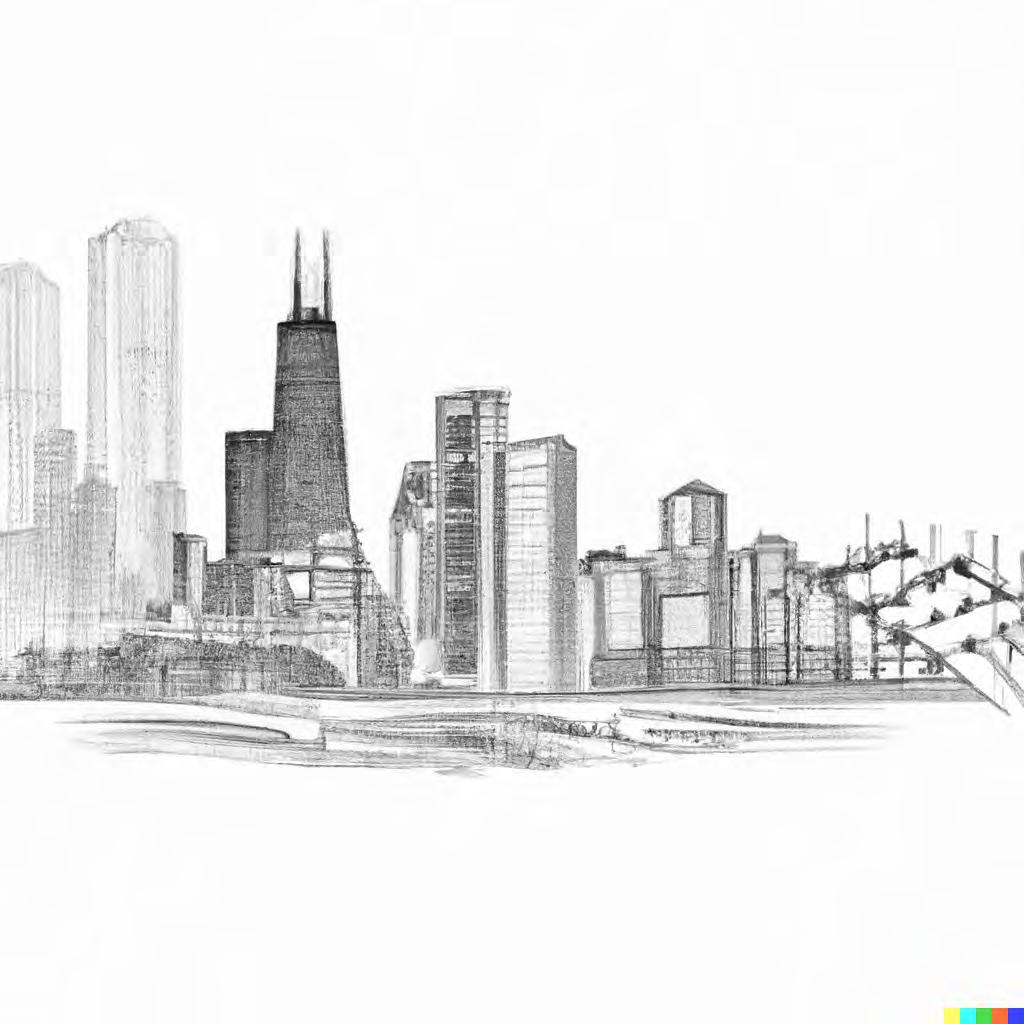 Page 19 Chris using Midjourney (prompt: Futuristic Chicago Skyline pencil drawing)