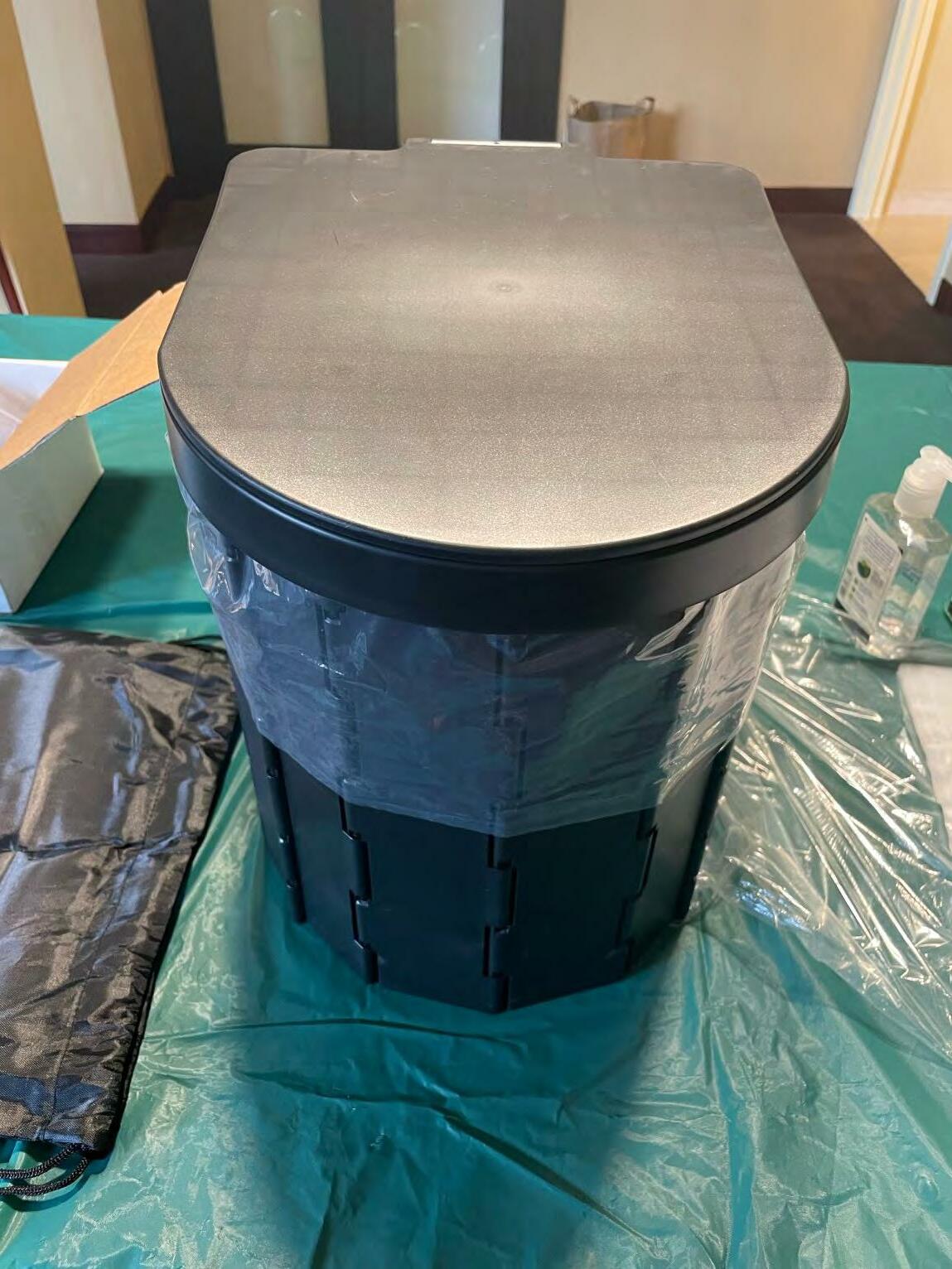 The original design, much like the first space shuttle designs, called for a grander plan. We were going to acquire an actual toilet and flush the lemonade and Pimms together. That had to be abandoned because it’s frankly batshit crazy and nobody wanted to deal with getting the damn thing into the suite or explaining to the staff why we had brought our own facilities. However, through the magic of Amazon, a porta potty for camping was procured, along with
