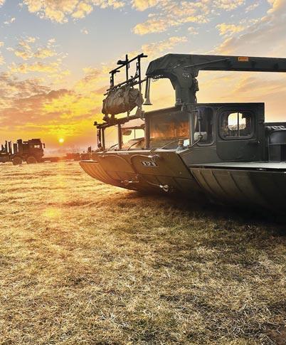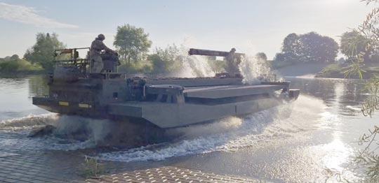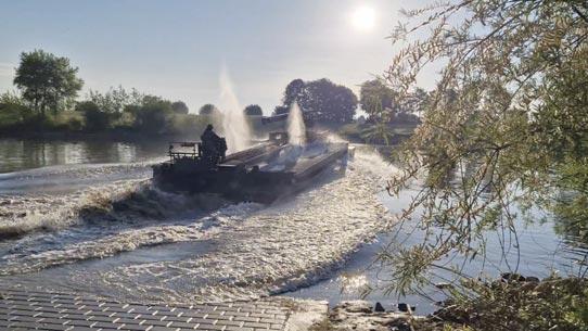 The M3 amphibious vehicle itself is an all-terrain, selfpropelled platform built to operate in both land and water environments. When deployed, the M3 can travel on public roads like any other conventional HGV, allowing it to cover extensive distance, sometimes hundreds of kilometres, before reaching its designated crossing site. Once on-site, a well-drilled and experienced crew can rapidly assemble an 8-rig bridge, for a crossing approximately 100 meters in