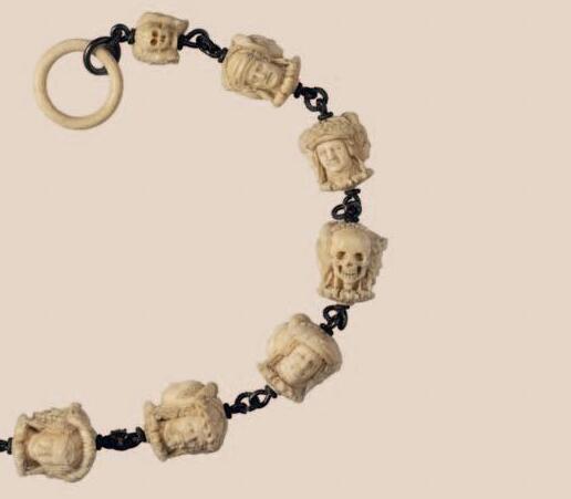 une tête de mort. Les perles symbolisent le déroulé de