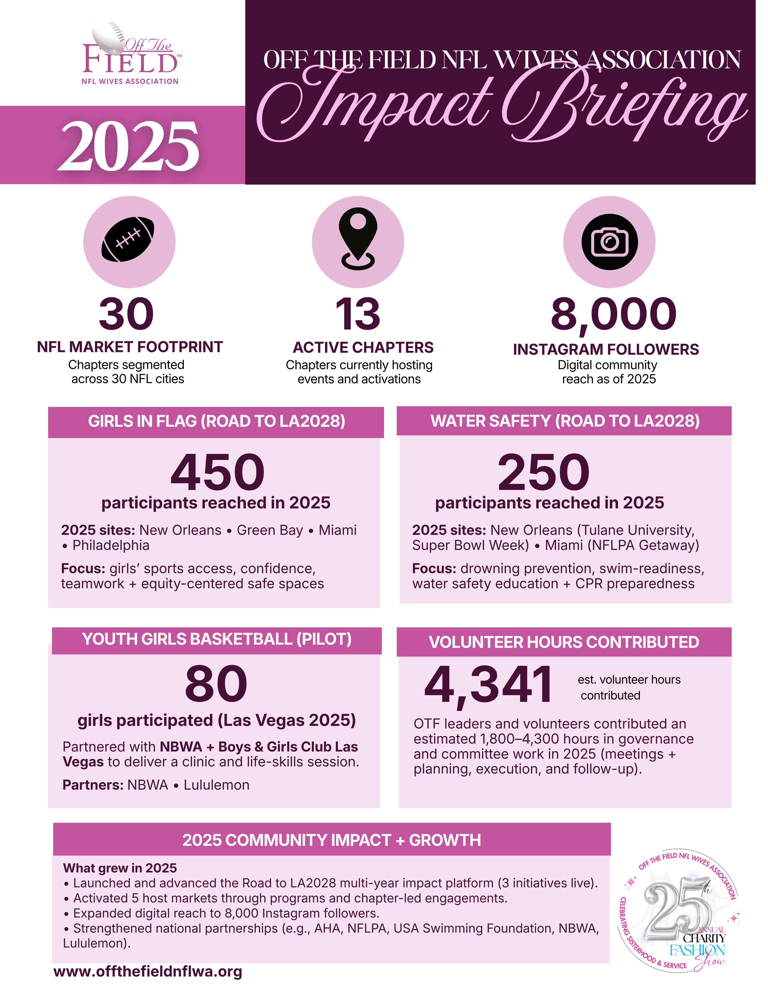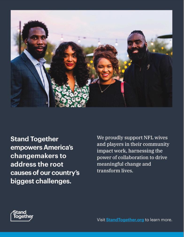 To everyone joining us today, thank you for standing with us. Your presence is both a celebration of our 25 year legacy and a reaffirmation of our commitment to sisterhood, service, and support. As we honor the womenwholaidthisfoundation,welookforwardwithhopeandintentiontothenextgenerationofNFLwives andsignificantotherswhowillcarrythisworkforward