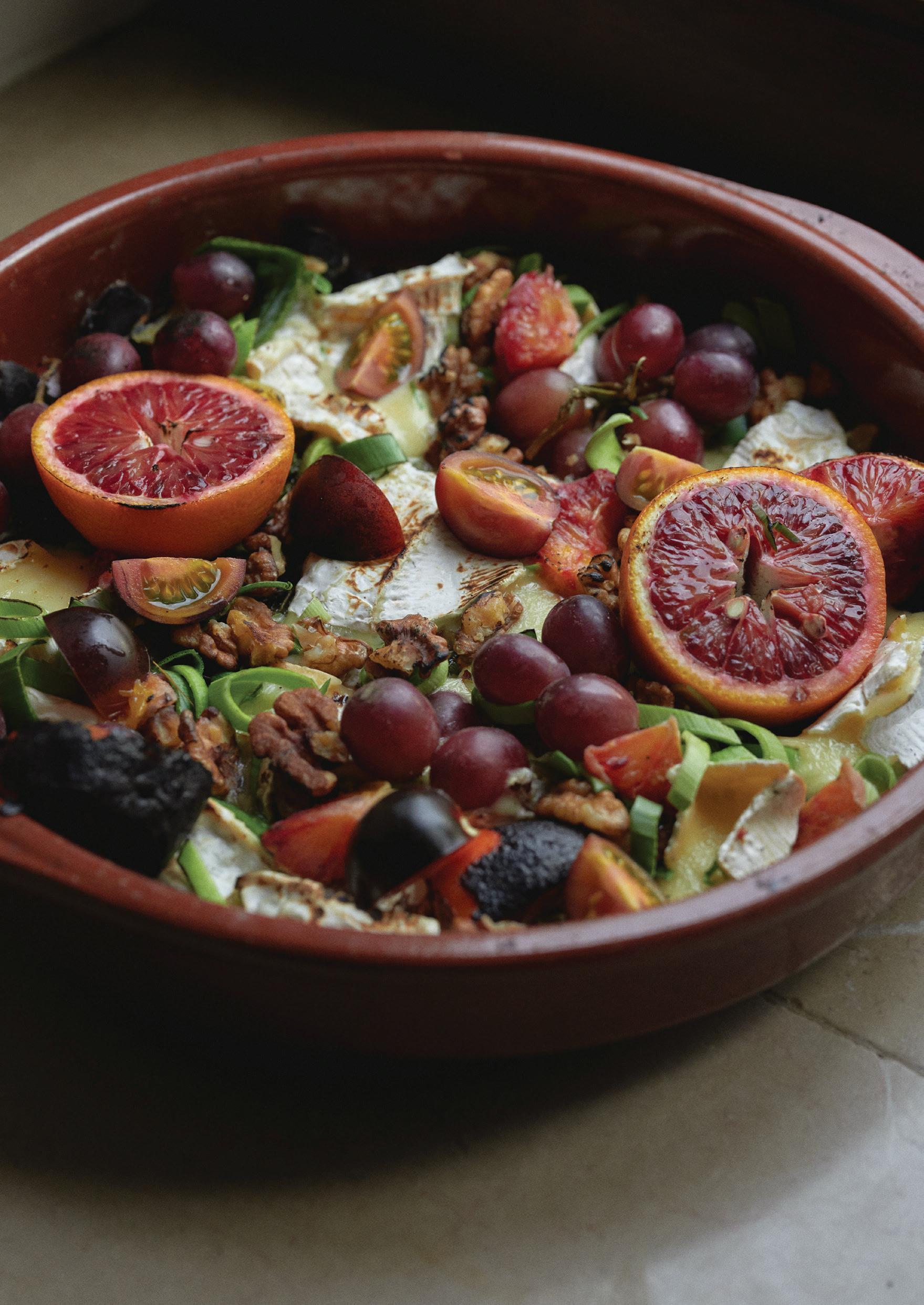 Gegrilde camembert met geroosterde bloedsinaasappels en druiven