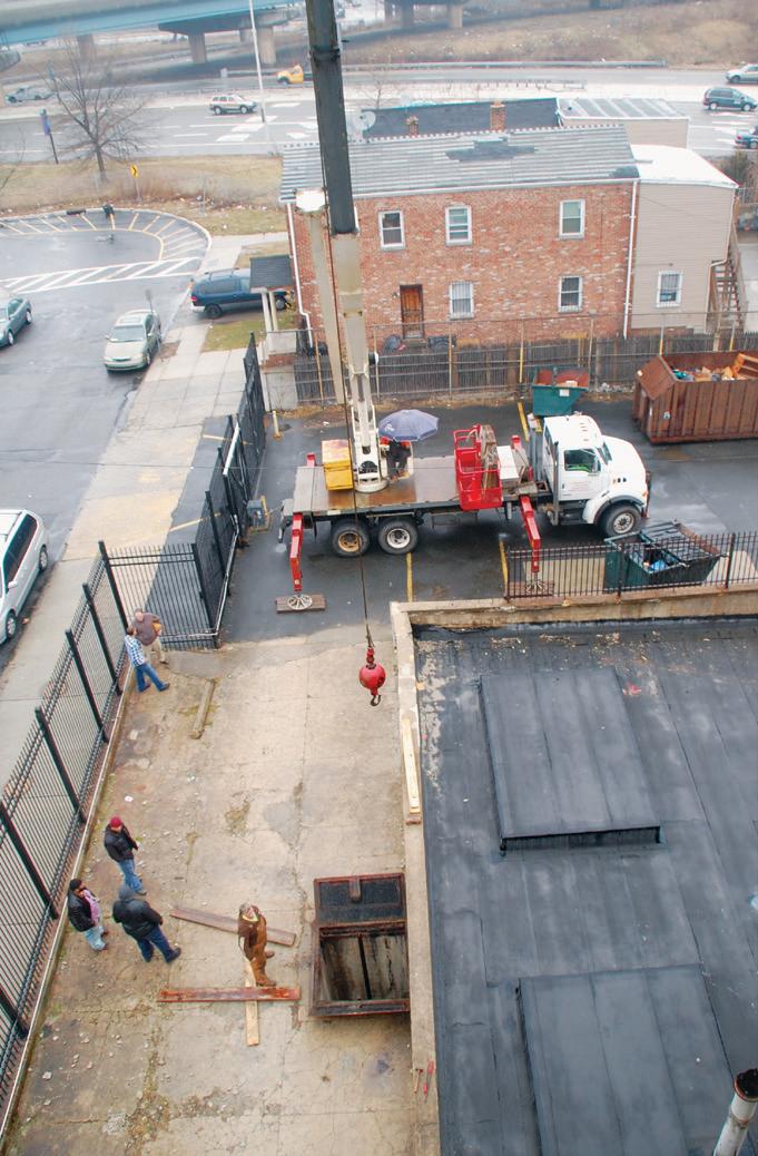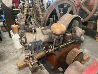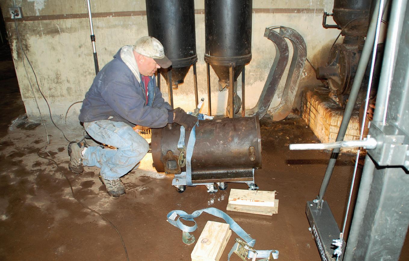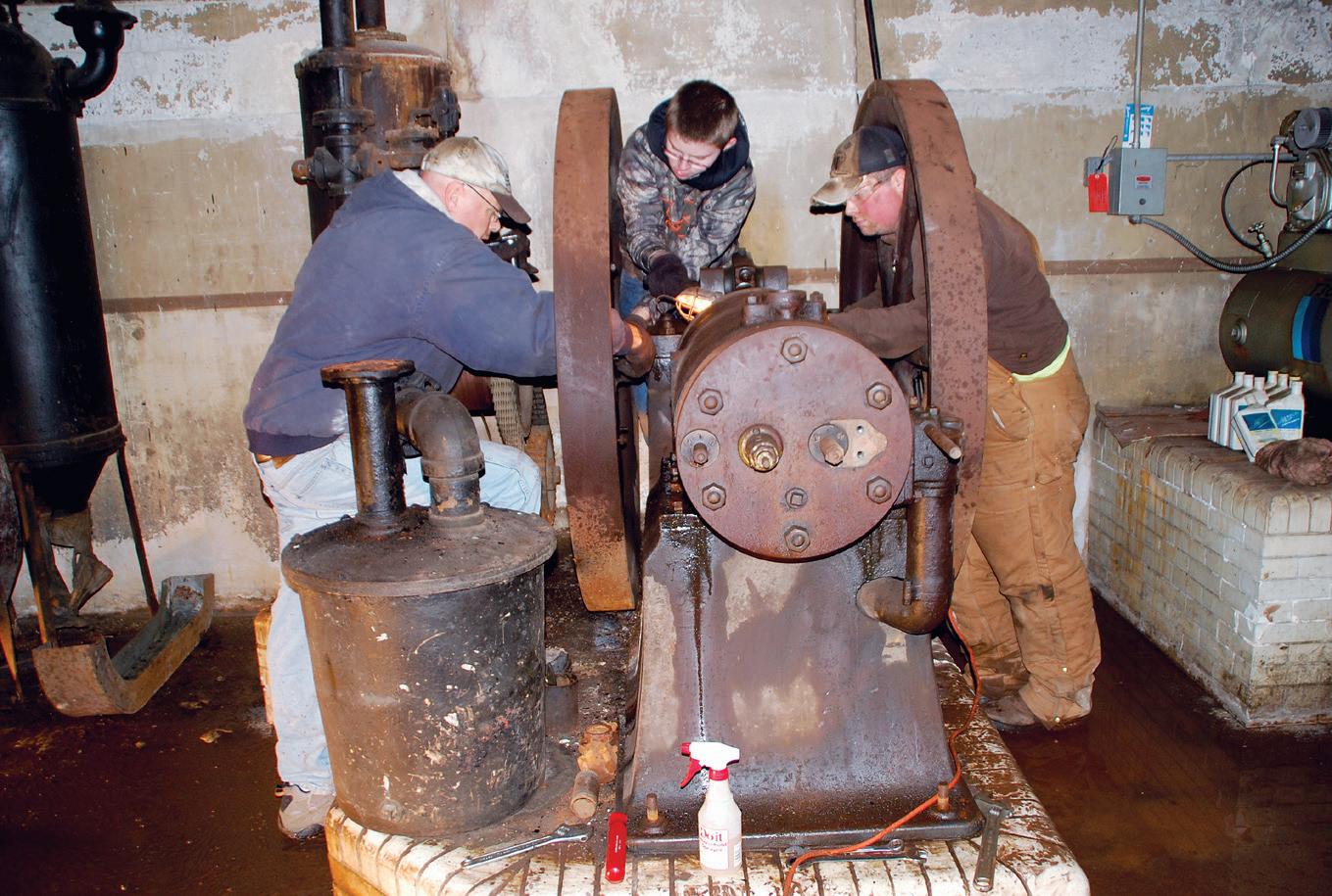 photos of the building, the steps, the corners, and the doors the engine would have to be hauled through, up, around, and out to get the engine to ground level. After several phone calls back and forth with questions about the building and specifics on the engine, Tim mentioned all the brass was stolen when the building sat empty in the 1990s. With no identification, I wasn’t sure what size the engine was. With Tim’s measurements and my research, I was pretty sure it was a 12 to 14hp old-style Backus.