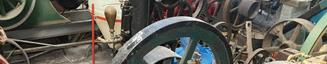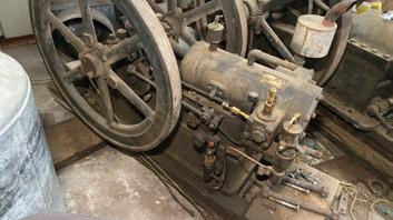 flights of stairs and through a hallway with white ceramic brick walls on one side and a concrete block wall with high windows at the top on the other side. When we reached the boiler area, there were several entrances. The door on the left was the room with the engine. We were all so excited to go into this room and see this engine. We were led through the door and there she sat, a beautifully preserved 14hp Backus engine, on its original site. The engine was sitting on a base made out of glazed white ceramic bricks. The grease can and brushes were still sitting next to the engine as if the mechanics just left yesterday. You could just imagine, back in the day, the white brick and the engine room being meticulous. The lights in the