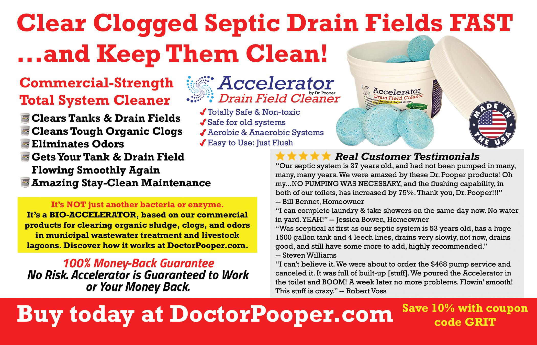 THIS BEFORE PUMPING your septic system or replacing your drain field! Accelerator by Dr. Pooper Drain Field Cleaner is a revolutionary non-toxic commercialstrength septic treatment that clears organic solids from septic tanks and drain fields. Money-back-guarantee! Order at DoctorPooper.com