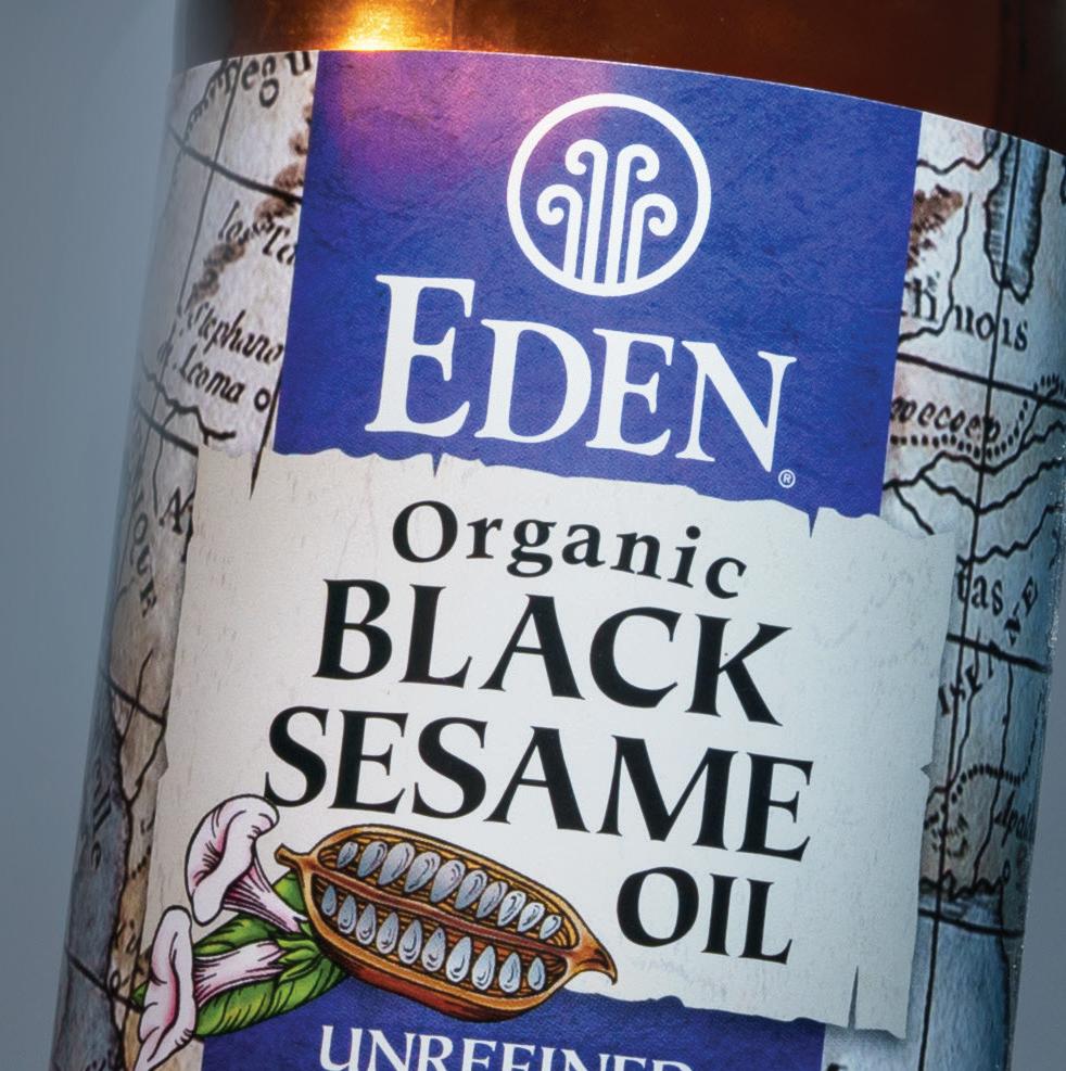 Eden Black Sesame Oil –unrefined, whole, black sesame, cold pressed, no chemicals used. The first pressing oil is bottled after filtering through pure cotton. Amber glass protects its nutrients and taste. Arguably the finest sauté oil. Sesame oil keeps well for extended periods and is excellent for all cooking methods and styles.