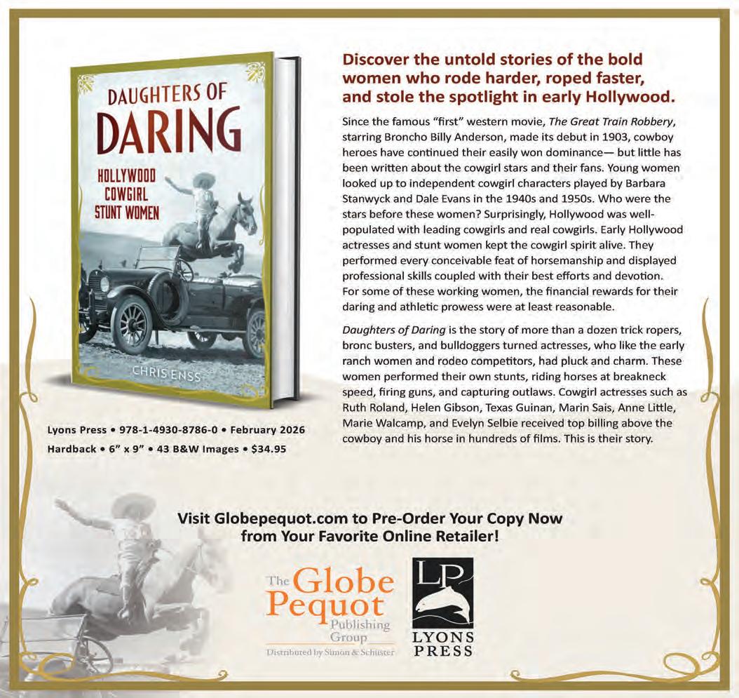 Chris Enss is a New York Times bestselling author who has written about women of the Old West for more than thirty years. She’s penned more than fifty books on the subject and been honored with eleven Will Rogers Medallion Awards, two Elmer Kelton Book Awards, an Oklahoma Center for the Book Award, three Foreword Review Magazine Book Awards, and two DOWNING Journalism Awards from Women Writing the West. Here latest book, the critically-acclaimed Daughters of Daring: Hollywood Cowgirl Stunt Women will be available everywhere books are sold February 3, 2026..