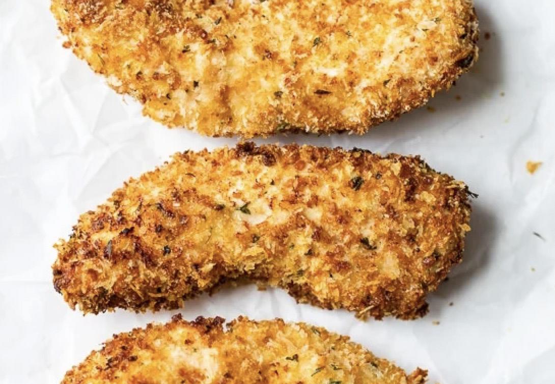 Dip chicken in egg, then into the breadcrumb mixture and shake off excess. Place on a cutting board and spray both sides of the chicken generously with oil.