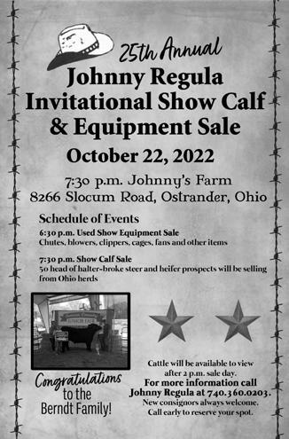 11.19.22 Claylick Run Sale Facility • Newark, OH Saturday • Noon Fall Angus Classic OHIO LIVE ONLINE BIDDING topshelf-auctions.com For more information or to request a sale book contact: Dan Wells, Sale Mgr. • 740-505-3843 danwells@ohioangus.org Featuring leading Angus genetics from Ohio and surrounding states!