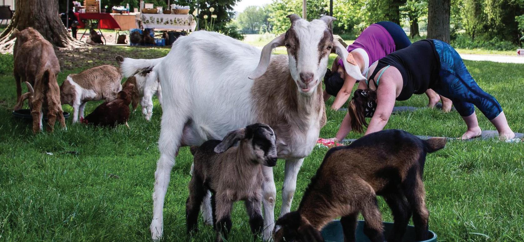 Mind, body, and goats: Animals enhance yogis’ connection to the land during classes at member’s farm.