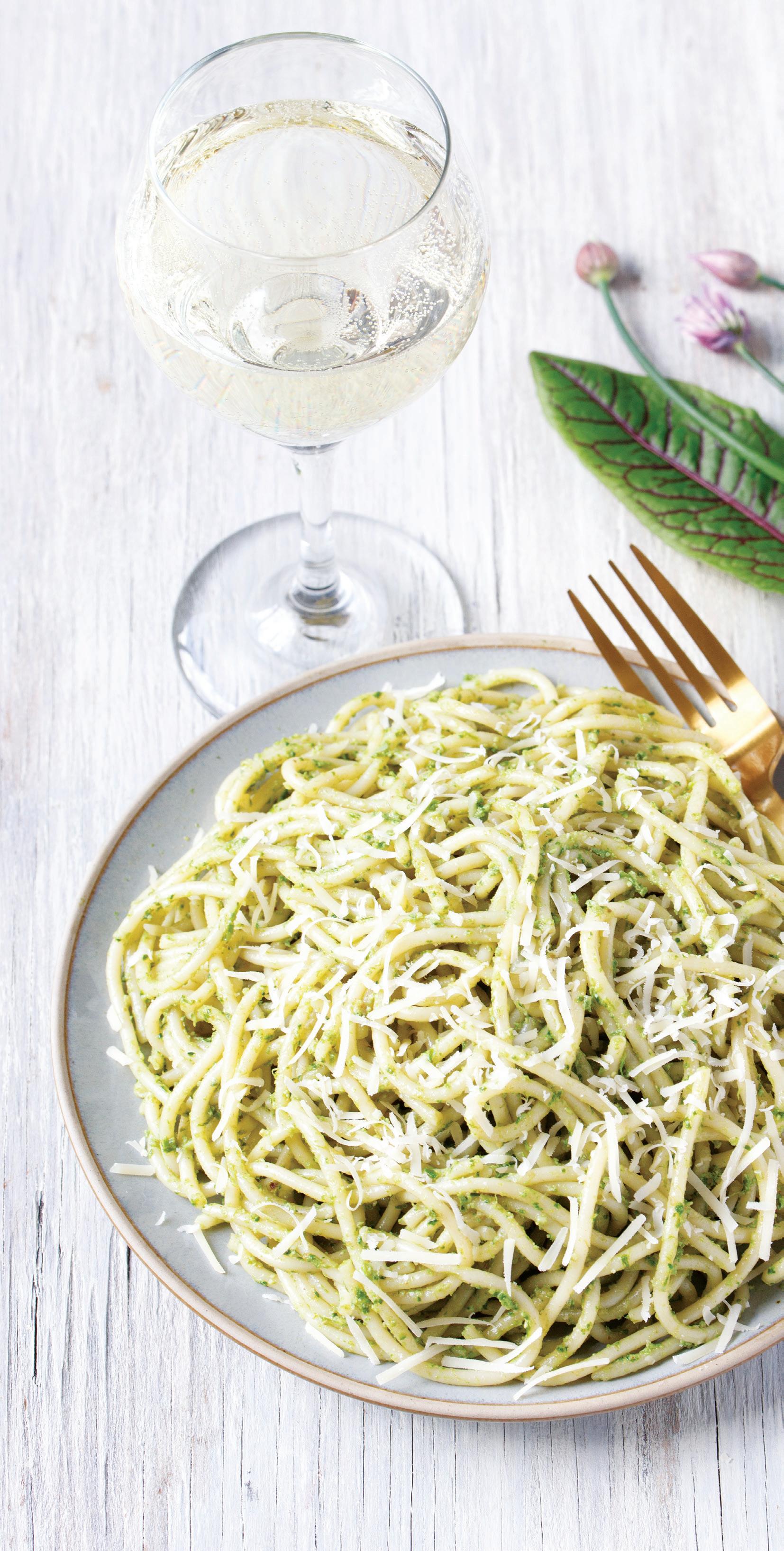 Lots of ingredients can be made into great pesto: basil, of course, as well as arugula, spinach, parsley, carrot greens, and fennel fronds; this one features sorrel and chives, two fast-growing and spreading perennials. Sorrel, while less commonly known, is easy to grow in Ohio and, like chives, is one of the first things to come up in spring and lasts all the way through fall. Sorrel has a tart, lemony flavor, perfect for pesto. Harvest herbs at the end of the season to make a large batch to freeze for quick dinners all winter long. Note: Sorrel comes in many varieties; one is red-veined, which would likely influence the pesto's color.