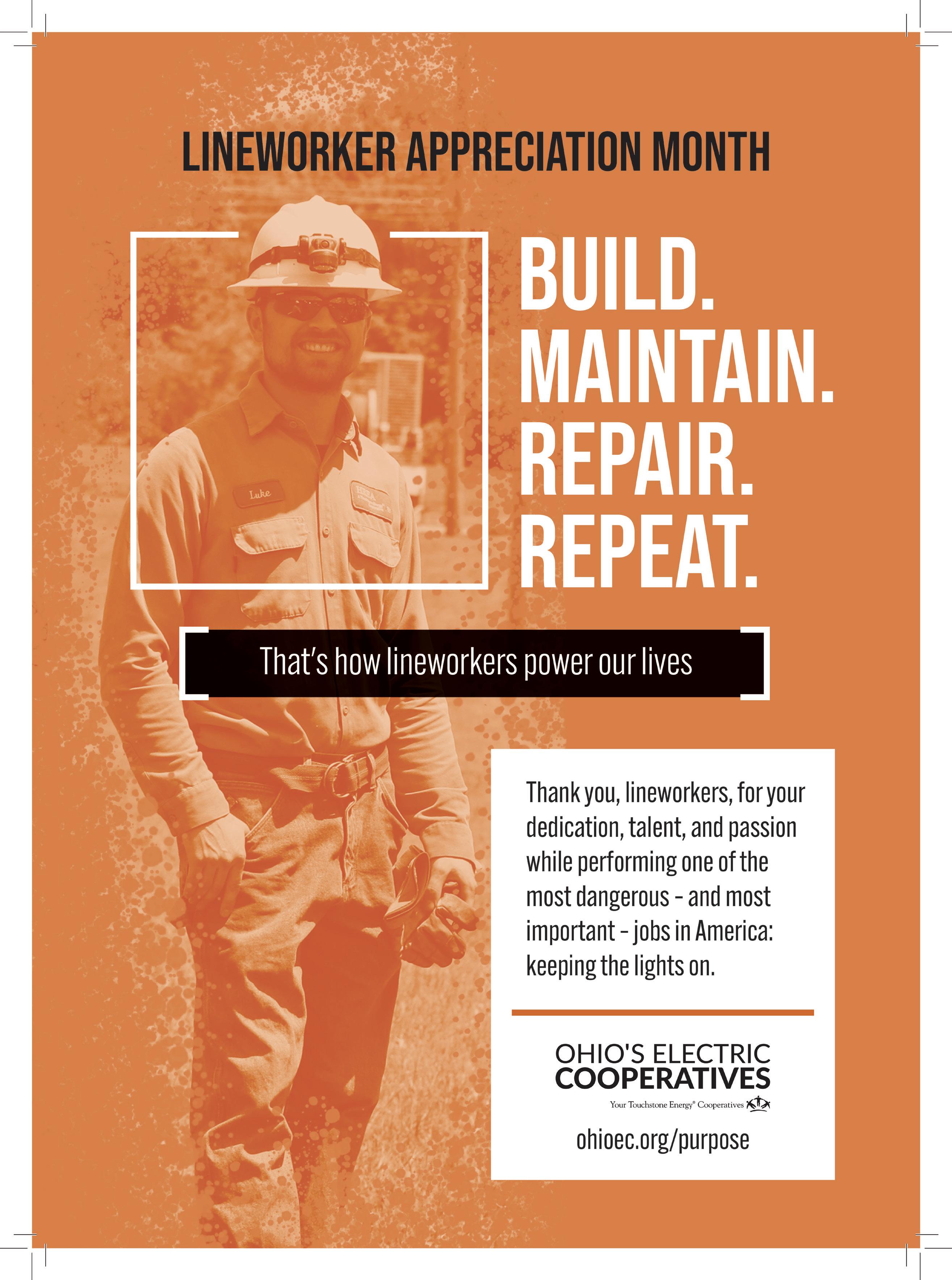 Ohio’s electric cooperatives have invested in our own lineworker training and apprenticeship program to ensure the people keeping your lights on get the best training possible to safely and efficiently work through the challenging conditions they are faced with every day. You can learn more about the path to becoming a lineworker, the training it takes, and the essential role they play on page 4 , as we celebrate lineworkers this month.