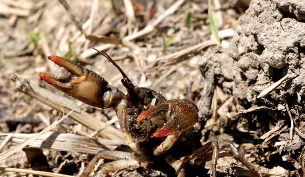 Take along a shovel, a bucket, and a pair of gloves. What you’ll be digging for are burrowing crayfish, which build a mud chimney — or “castle” — several inches high, giving away their location. This is the ideal season of the year to look for the chimneys of burrowing crayfish, before vegetation emerges and makes them more difficult to see. The edges of moist farm fields and wet areas are good places to begin your search.