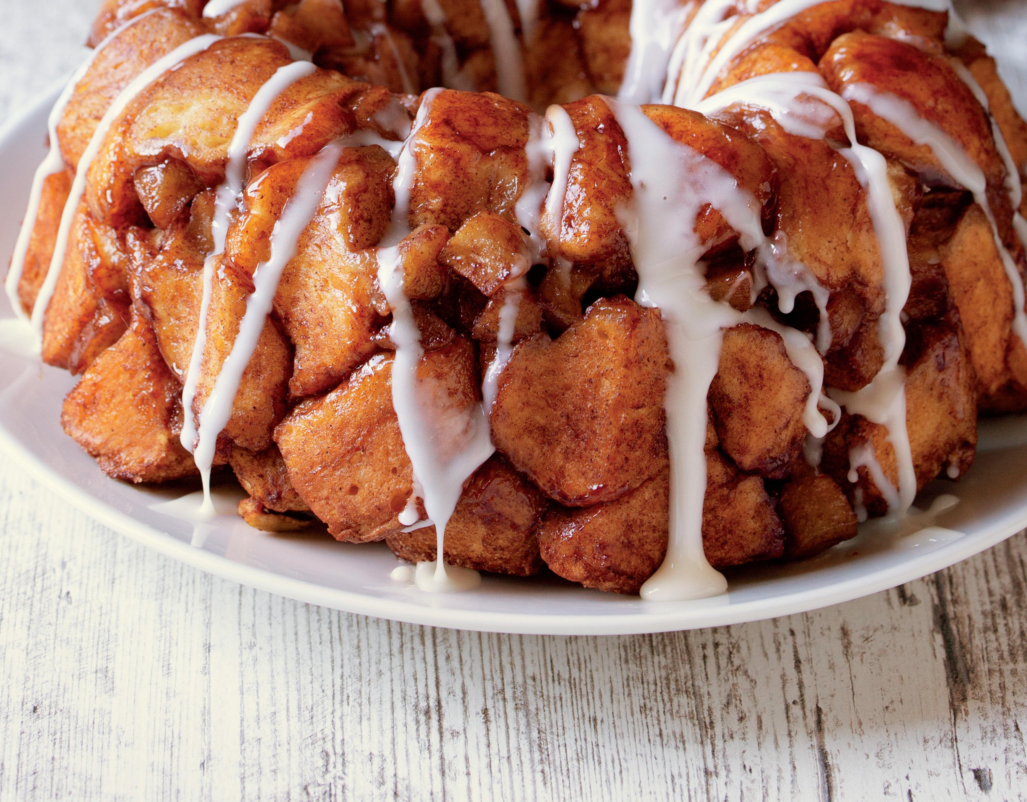In a large bowl, mix granulated sugar and cinnamon. Cut each biscuit into 4 pieces and add to the bowl with the cinnamon and sugar, along with the apples. Toss many times to coat. Heat oven to 350 F. Transfer coated biscuits and apples into a greased bundt pan. Pour butter evenly over top, then press down lightly on the top. Bake 40 to 45 minutes or until golden brown across top and a toothpick comes out clean. Cool 10 minutes, then run knife around edge of pan to loosen. Place heatproof serving plate over pan and flip over. Slowly loosen pan from bread. Whisk together powdered sugar and milk into an icing. Drizzle icing over bread. (If icing doesn’t drizzle easily, add a little more milk.) Bread is easy to serve and eat — just pull apart into chunks with your hands!