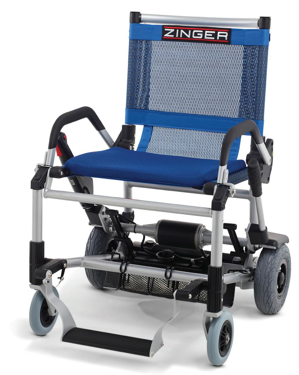 turn on a dime and even pull right up to a table or desk. With its compact yet powerful motor it can go up to 6 miles an hour and its rechargeable battery can go up to 8 miles on a single charge. With its low center of gravity and inflatable tires it can handle rugged terrain and is virtually tip-proof. Think about it, you can take your Zinger almost anywhere, so you don’t have to let mobility issues rule your life.