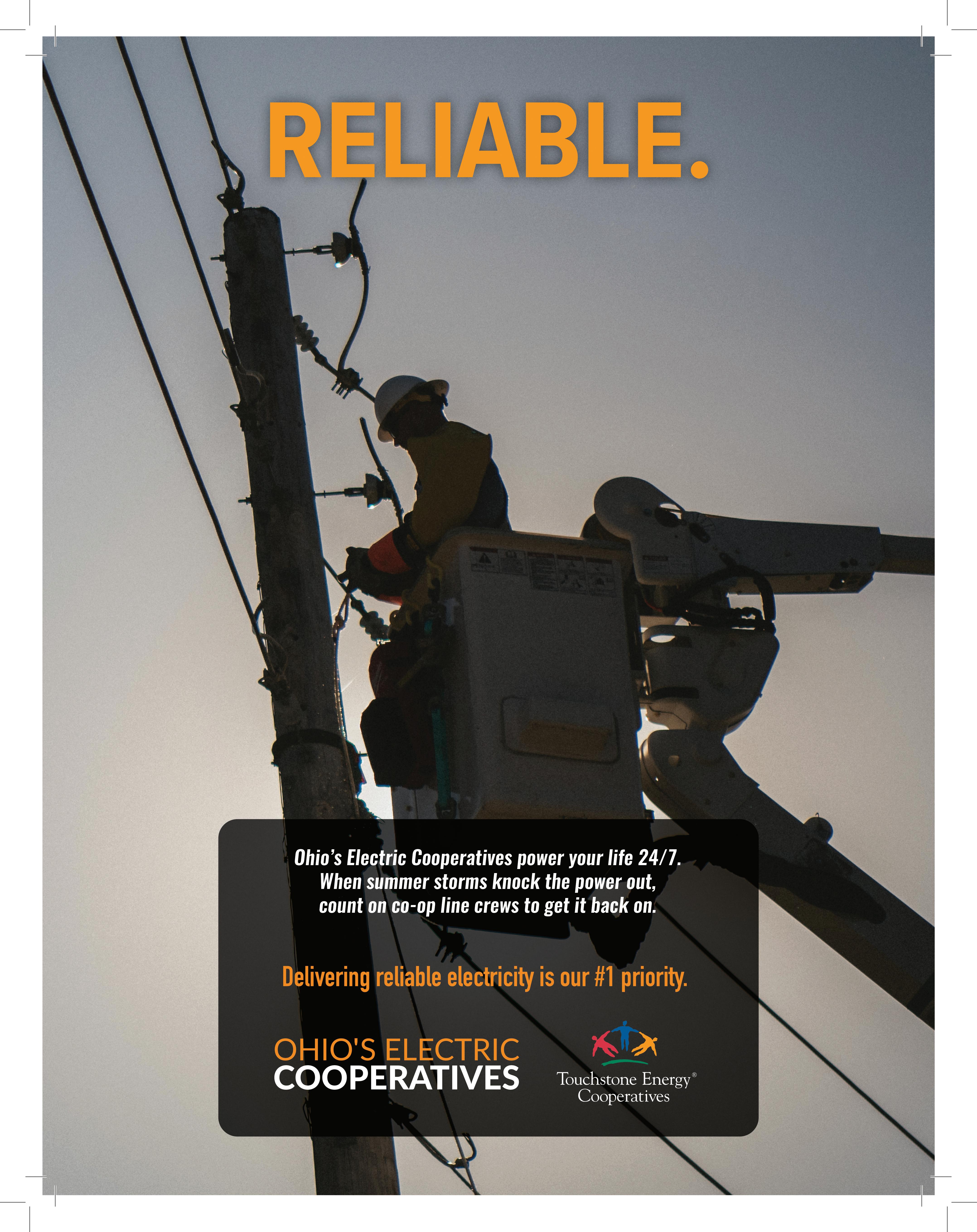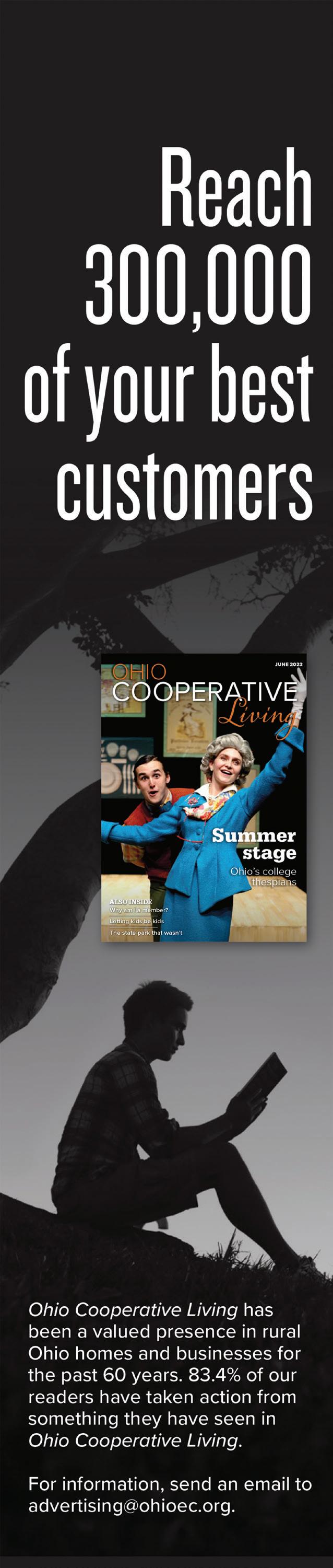POSTMASTER: Send address changes to editorial and advertising offices at: 6677 Busch Boulevard, Columbus, OH 43229-1101. Periodicals postage paid at Pontiac, IL 61764, and at additional mailing offices. Nothing in this publication may be reproduced in any manner without written permission from Ohio Rural Electric Cooperatives, Inc. All rights reserved. The fact that a product is advertised in Ohio Cooperative Living should not be taken as an endorsement. If you find an advertisement misleading or a product unsatisfactory, please notify us or the Ohio Attorney General’s Office, Consumer Protection Section, 30 E. Broad St., Columbus, OH 43215. Periodicals postage paid at Columbus, OH, and at additional mailing offices.