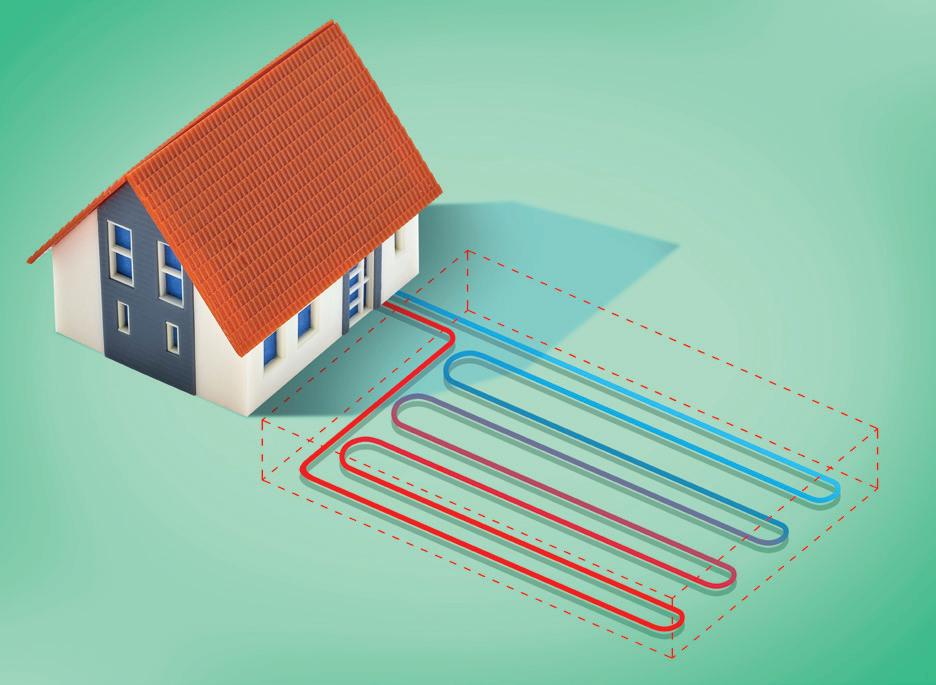 In the Midwest, the temperature just a few feet under the ground stays at a consistent 55 degrees, no matter the air temperature above. “The system uses pipes that circulate liquid through the ground to either extract warmth to heat the refrigerant or deposit the heat to cool the refrigerant,” Warnecke says. “On a day when it’s 90 degrees outside, it’s much more efficient to use 55-degree water to cool than to use 90-degree air. If it’s 15 degrees outside, it’s much more efficient to use 50degree water than that extremely cold air.”