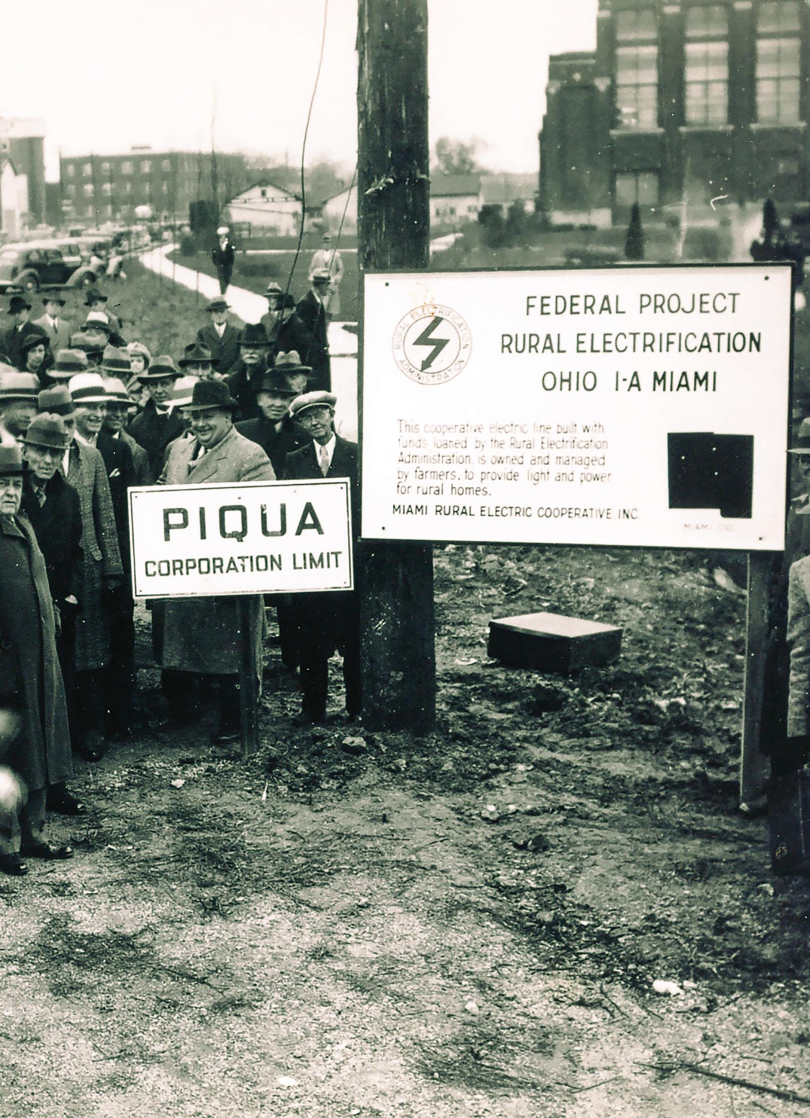 To most of the city-living population in Piqua (and everywhere else in the country, for that matter), it was just another utility pole. In truth, however, it marked the transformation of rural life in the United States. Owned by the fledgling Miami County Rural Electric Cooperative (known today as Pioneer Electric Cooperative), it was the first pole in the nation that had been financed by the brand-new Rural Electrification Administration — a key part of President Franklin Delano Roosevelt’s plan to pull the nation out of the Great Depression — and the first bit of solid evidence that electricity was indeed on its way to America’s farms.