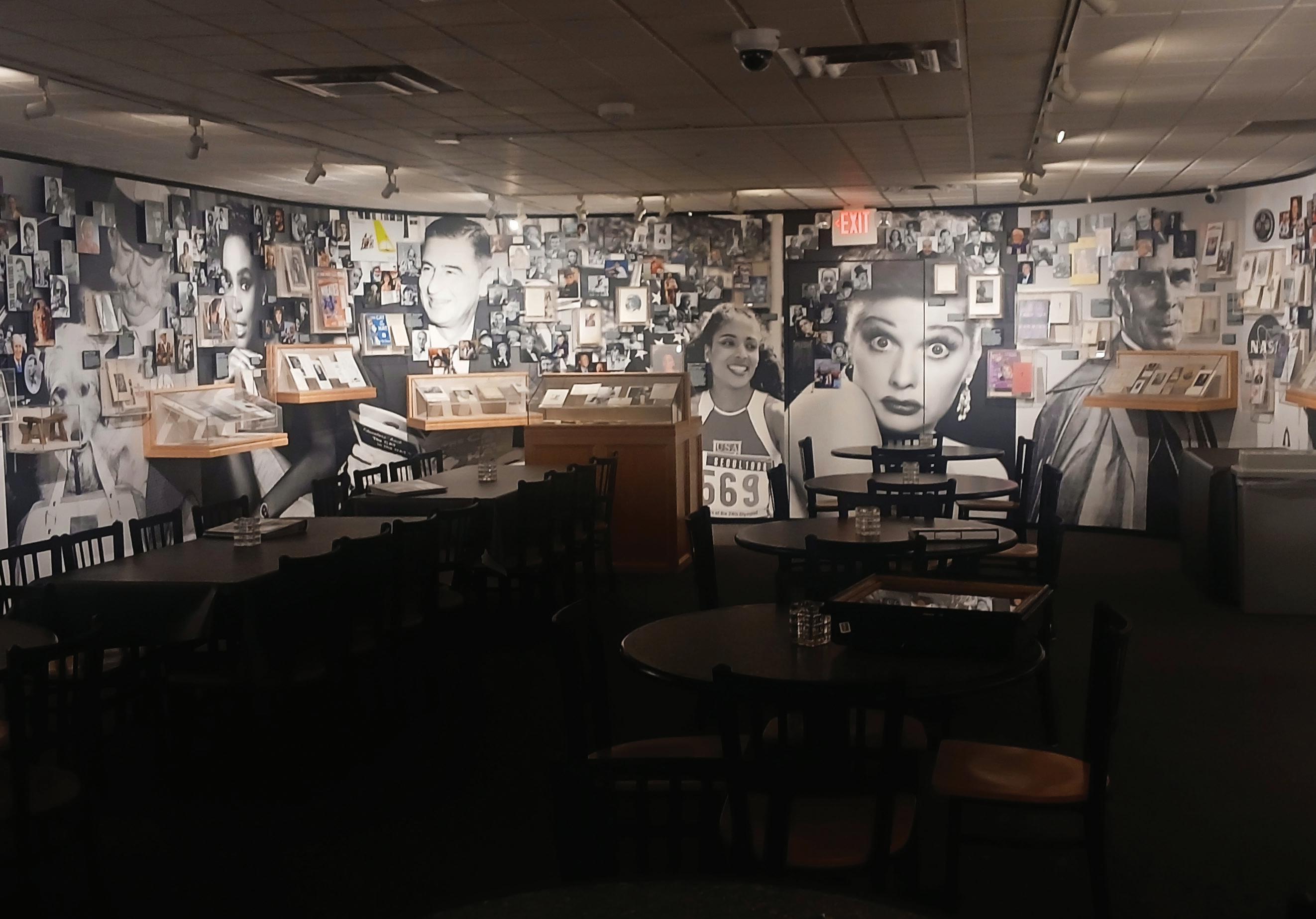The cases display more than just programs. There’s a miniature Lamb Chop that was given out at ventriloquist Shari Lewis’s 1998 funeral; a tissue packet given to guests at Leslie Nielsen’s 2010 funeral, emblazoned with “Stop crying!!! This is supposed to be a fun night. Love and laughs, Leslie;” and a (preserved) cookie from Rodney Dangerfield’s funeral with an imprint of the comedian’s face.