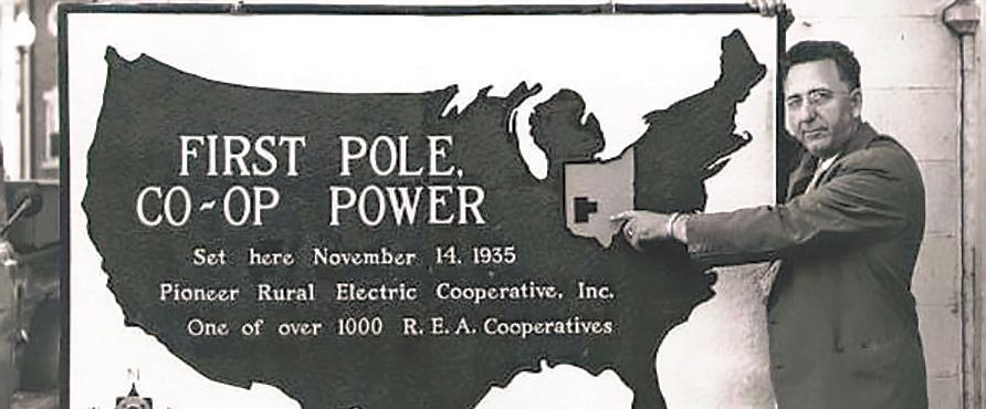 To most of the city-living population in Piqua (and everywhere else in the country, for that matter), it was just another utility pole. In truth, however, it marked the transformation of rural life in the United States. Owned by the fledgling Miami County Rural Electric Cooperative (known today as Pioneer Electric Cooperative), it was the first pole in the nation that had been financed by the brand-new Rural Electrification Administration — a key part of President Franklin Delano Roosevelt’s plan to pull the nation out of the Great Depression — and the first bit of solid evidence that electricity was indeed on its way to America’s farms.