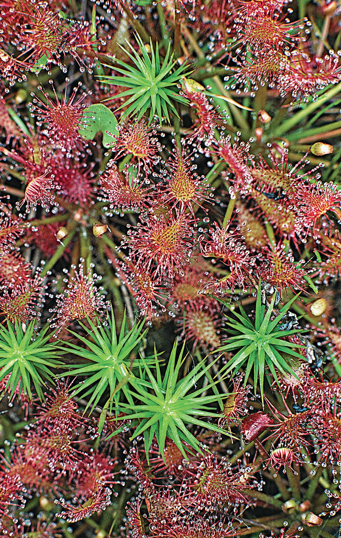 The fleshy leaves of sundew are covered with glandular tentacles tipped with droplets of sticky secretions. “The common name ‘sundew’ is in reference to how the droplets glisten in sunlight, resembling morning dew,” Denny says. “The sweet and very sticky substance topping the tips of the tentacles attract and then entangle insect prey.”