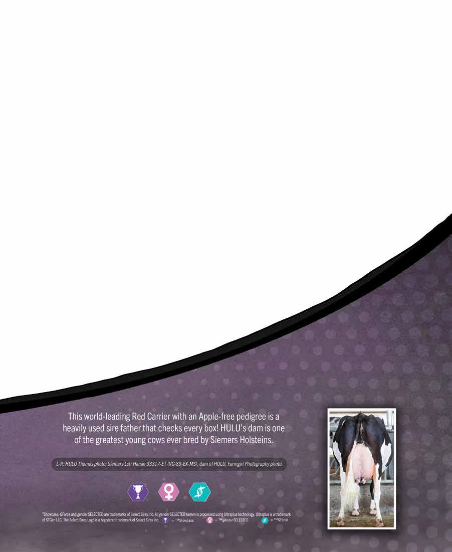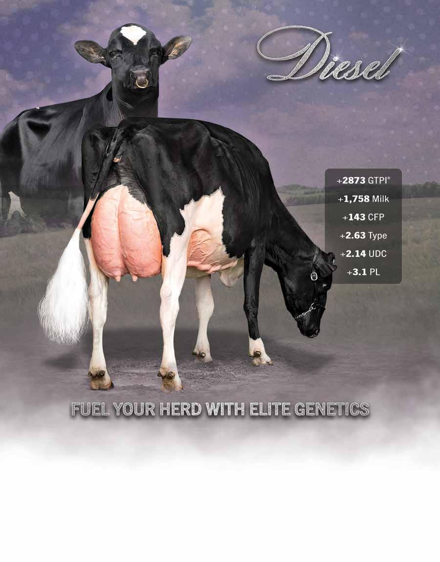 HARMONY x DOC x JEDI 7HO16954 DUCKETT DIESEL-ET S-S-I Doc Have Not 8784 (EX-96-EX-MS-DOM), dam of DIESEL, Fisher photo. Step on the accelerator to bring both high Type and elite production to your show string! DIESEL continues Have Not 8784’s legacy of driving a right-sided linear with open rib and eye-catching dairy strength to the Showcase™ lineup. 12/23 CDCB-S/HA Genomic Evaluations. % Rel: Yield 80, Type 79, PL 75. ®TPI is a registered trademark of Holstein Association USA. Your Success Our Passion. and the Select Sires logo are registered trademarks of Select Sires Inc, Plain City, OH. Showcase and gender SELECTED are trademarks of Select Sires Inc. gender SELECTED semen is processed using Ultraplus™ technology. Ultraplus is a trademark of STGen LLC. DIESEL qualifies for semen export to Canada. DIESEL photo by Thomas. = gender SELECTED = Showcase (614) 878-5333 www.cobaselect.com