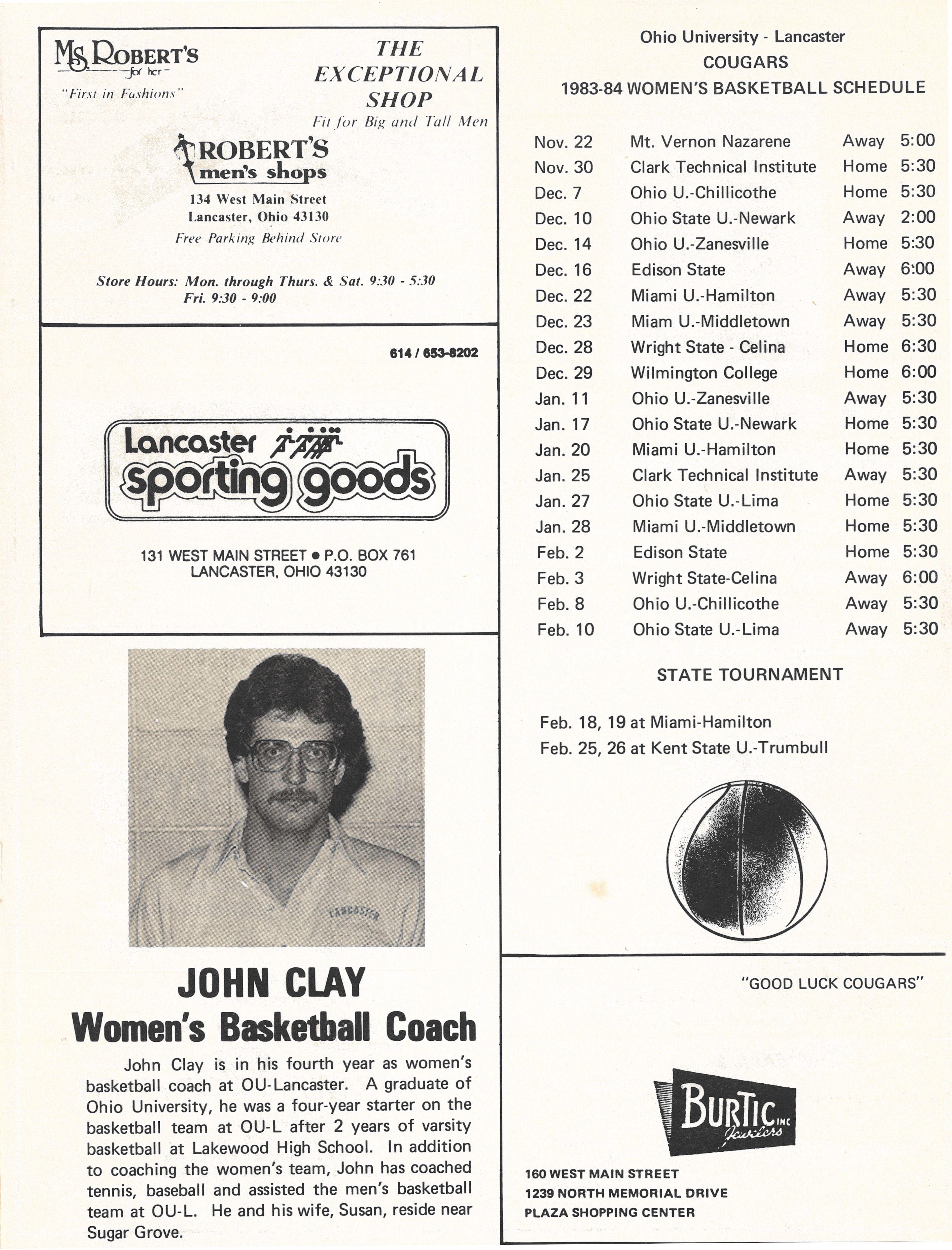 Ohio University Lancaster Cougars Basketball Program - 1983 to 1984