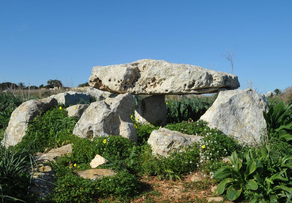 Perched high above the deep blue waters of the Mediterranean, the Ta' Ċenċ plateau is located in the village of Sannat. The bright white rocky garigue landscape, is home to various archaeological remains. At this lofty vantage point, it is easy to feel the raw power of nature's majestic grandeur and serenity. If you hike around the plateau, it is not easy to pinpoint the perimeters or the remains of the Neolithic Temple known as Borġ talImramma. However, upon careful examination, one can see that the area seems 'littered' with pretty large boulders, which are the vestiges of this temple. The dolmens at Ta' Ċenċ cannot be missed from the main road as they starkly contrast with the skyline. These Bronze Age burial memorials are similar to other dolmens found in Italy.