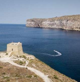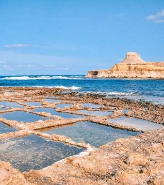 hike up the steep side of the cliff face. Follow the path to the Xlendi coastal tower and the surrounding area. The recently restored tower, juxtaposed on the edge, has stood on guard since the 17th century, overlooking the rough and craggy salt pans at the edge of the coast, and echoes a timeless vibe. Pause and sit down on the smooth, yellow limestone rock hollows, shaped like cradles by centuries of relentless waves and sea spray. This is yet another perfect spot for sunset chasers to soak in the magic.