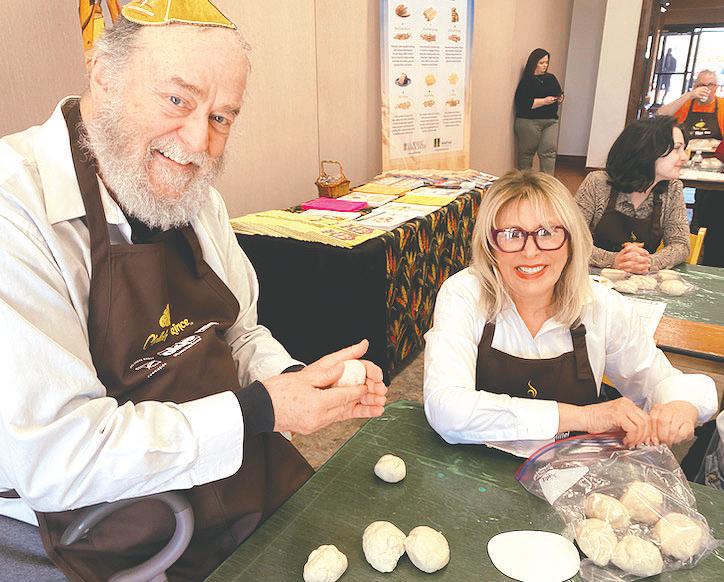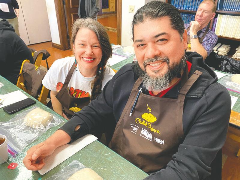 Pat McGuigan and Oklahoma Israel Exchange Executive Director Edie Roodman learn the fine art of braiding Challah. OKIE brought in the Challah Prince Idan Chabasov from Israel to teach those attending a special class how to perform the technique.