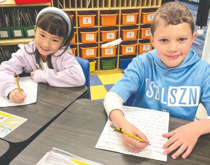 At left, Arianna Du, and, at right, Liza Stuart explain the best places to hide an Easter egg. They are first graders at Heritage Hall.