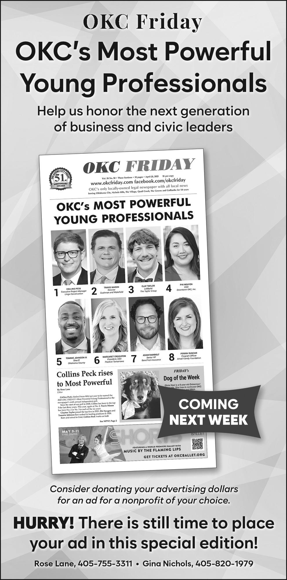 Official Legal Newspaper For OKLAHOMA, OKLAHOMA CITY and OKLAHOMA COUNTY, including NICHOLS HILLS and THE VILLAGE Oklahoma City FRIDAY, Office of publication, 10801 N. Quail Plaza Drive, P.O. Box 20340, Oklahoma City, OK 73156. FRIDAY is published each Friday by Nichols Hills Publishing Co., Inc. It is an official, legal newspaper, under Oklahoma law, published in Oklahoma County, primarily serving Oklahoma City but also The Village and Nichols Hills. Mail subscription price in county $35. elsewhere in Oklahoma $45, elsewhere U.S. $45. Newsstand price $1. Periodicals postage paid at Oklahoma City, OK.POSTMASTER: Send address changes to: FRIDAY, P.O. Box 20340, Okla. City, OK 73156. MEMBER: Oklahoma Press Association, National Newspaper Association, Greater Oklahoma City Chamber of Commerce, Northwest OKC Chamber of Commerce. Represented nationally by USSPI, New York, Chicago, Atlanta, Los Angeles, Detroit, Dallas.