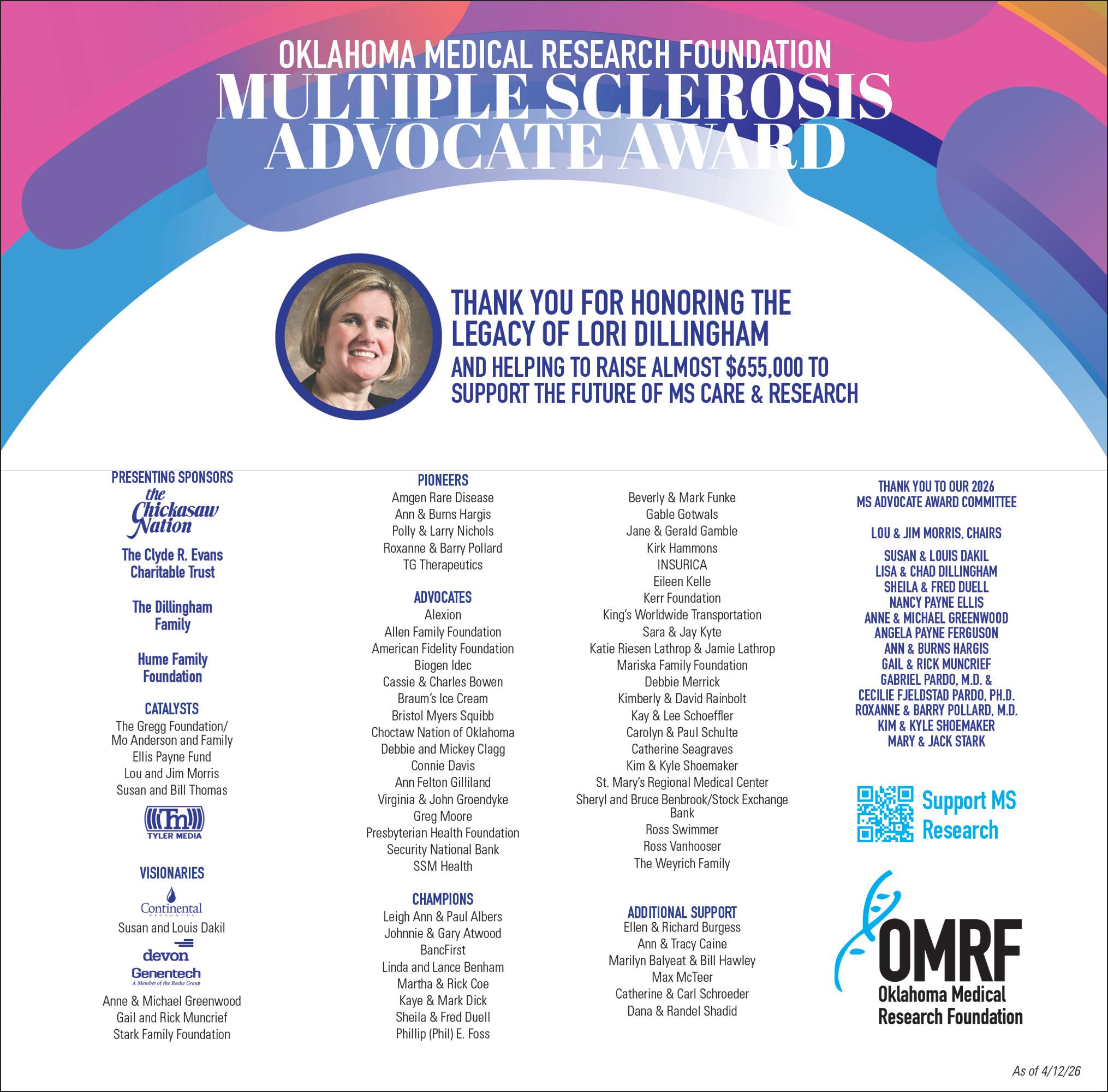 two of Oklahoma City’s most dedicated and visionary community leaders, whose shared commitment to service has shaped the cultural, educational and civic life of our city,” said Susan Davis Jordan, Allied Arts 2026 Campaign co-chairman.