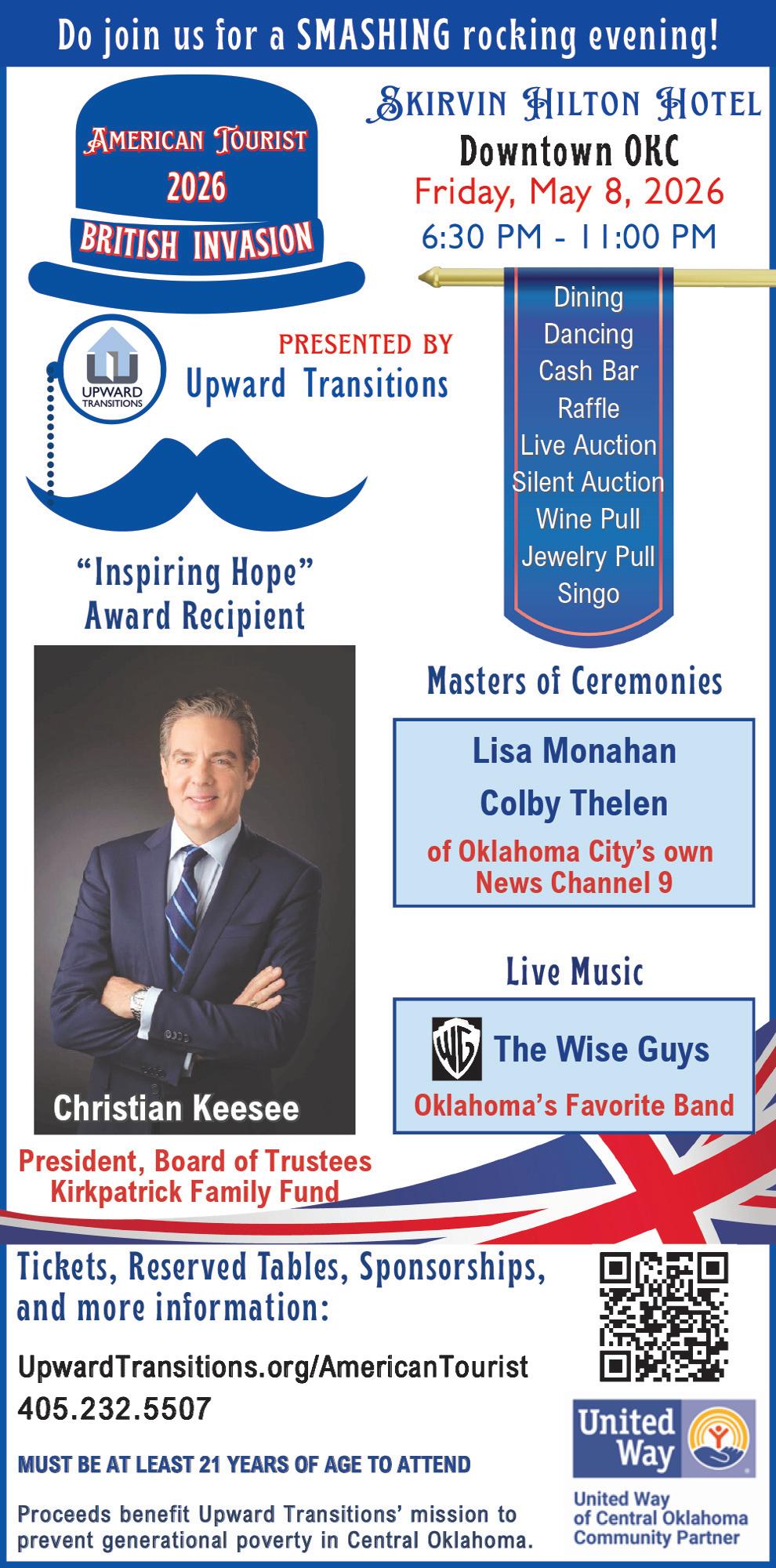 Upward Transitions has announced that Christian Keesee, chairman of Kirkpatrick Bank and president of the Kirkpatrick Family Fund, has been named the 2026 recipient of the organization’s prestigious Inspiring Hope Award. The award is to be presented on May 8 during Upward Transitions’ annual gala, American Tourist: British Invasion, 6:3011 p.m. at the Skirvin Hilton