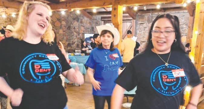 D-DENT staff member Karen Chadwell honors founder Dr. J. Don Harris at the organization’s BBQ Boots & Brews fundraiser. At right, Oklahoma Smoke won the cooking competition with their dish of ribs with mac and cheese. Below, staff members Kiera Powell and Catherine (Cat) Ellis show off their dance movies as 2nd Chance Band provided entertainment.