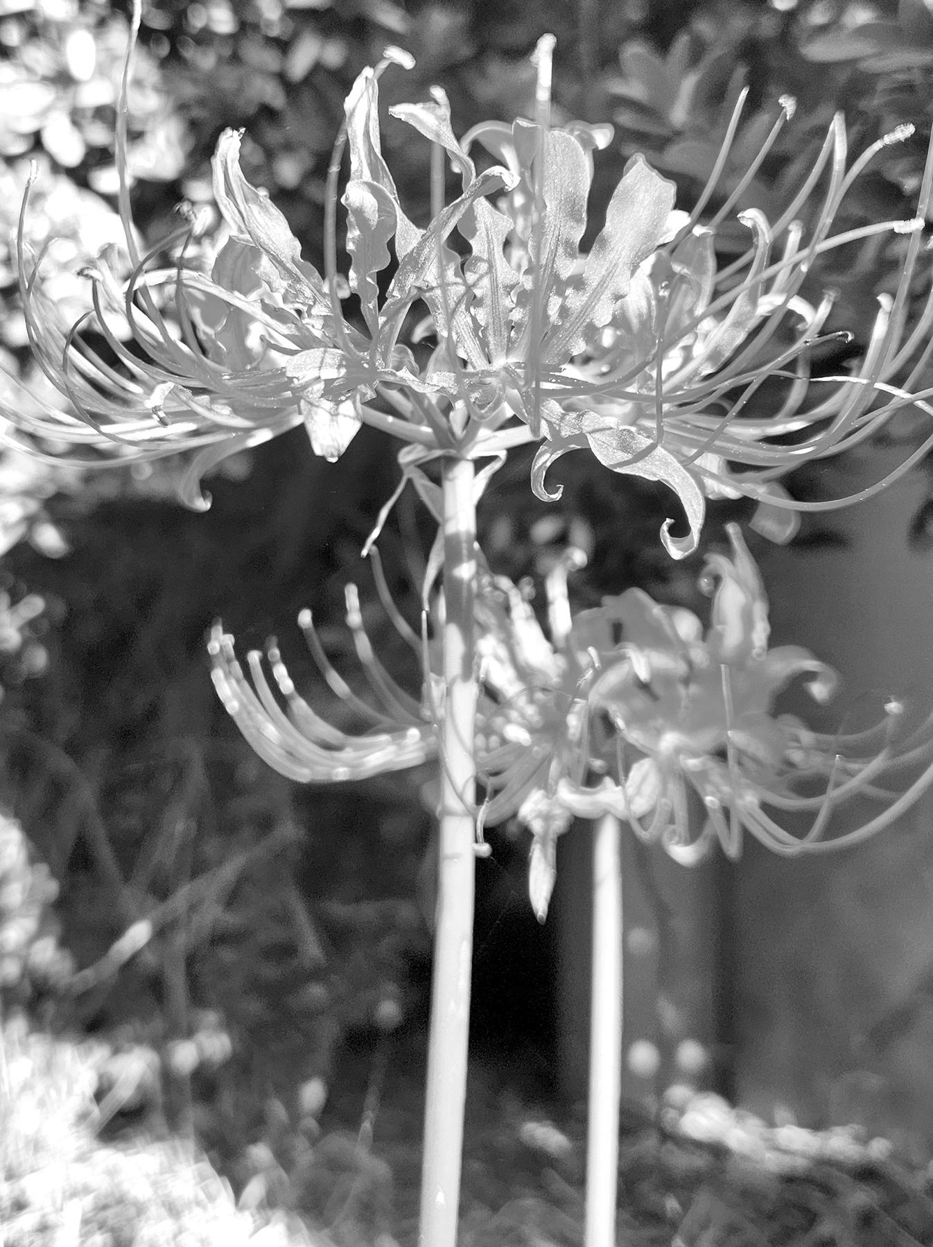 The flowers just suddenly appear and grow very fast. Mine are about a foot tall with four to six twoinch long flowers, arranged in flower clusters with short stalks that branch out from a single point of the main stem, like the ribs of an umbrella. When in full bloom, spindly stamens, likened to the image of spider legs, extend slightly upward and outward from the flower’s center.