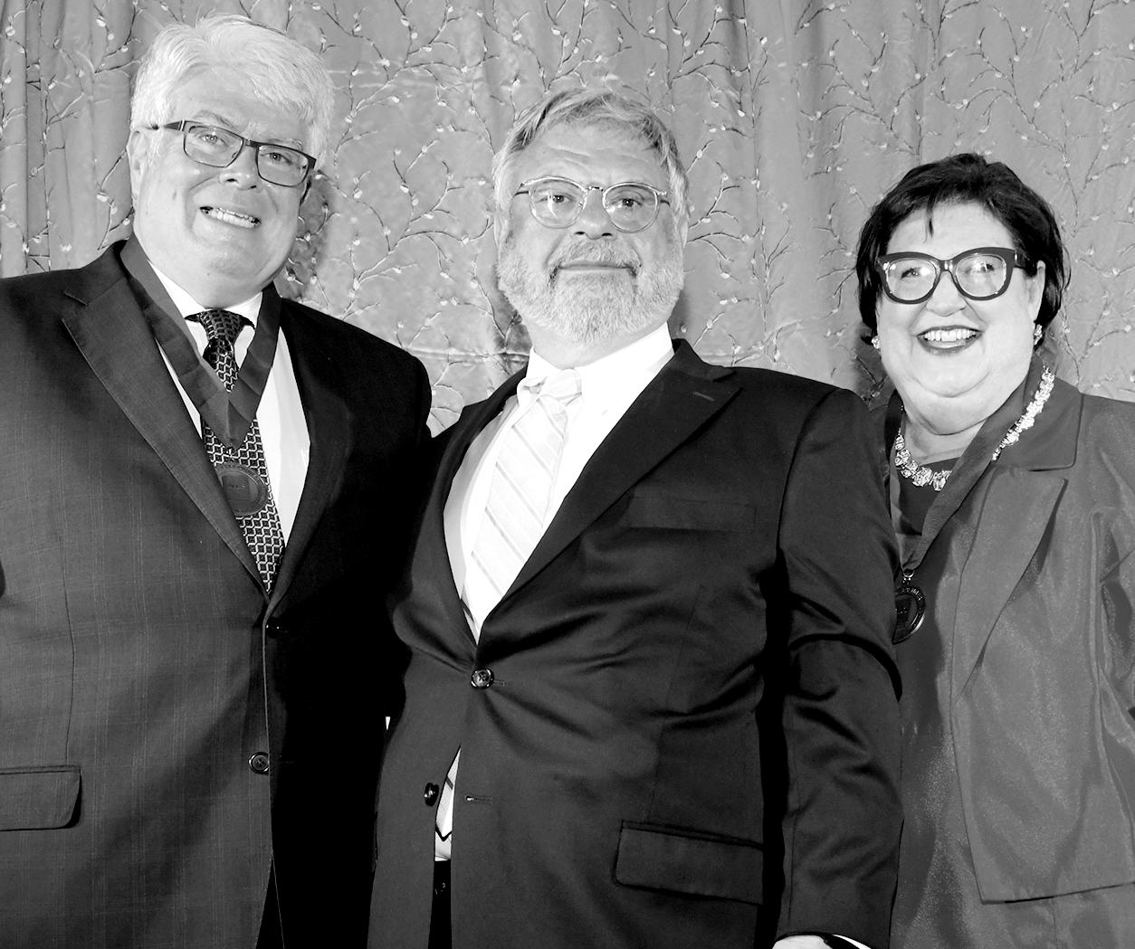 Chad Richison, center, Cattle Baron’s Ball Award recipient, with emcee Jordan Dafnis and Jeff Fehlis, South Region executive vice president, American Cancer Society.