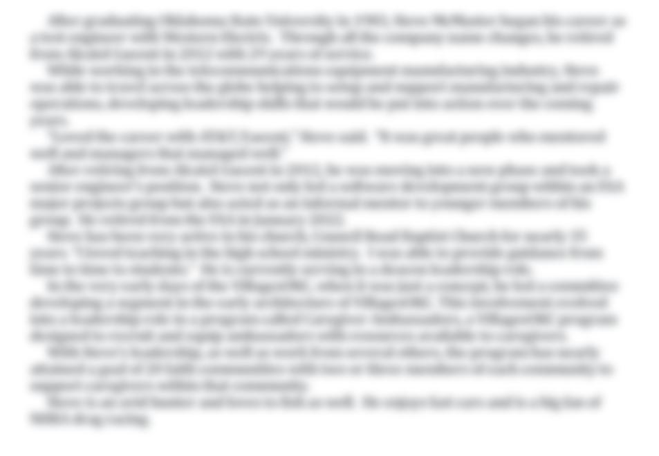 In the very early days of the VillagesOKC, when it was just a concept, he led a committee developing a segment in the early architecture of VillagesOKC. This involvement evolved into a leadership role in a program called Caregiver Ambassadors, a VillagesOKC program designed to recruit and equip ambassadors with resources available to caregivers.