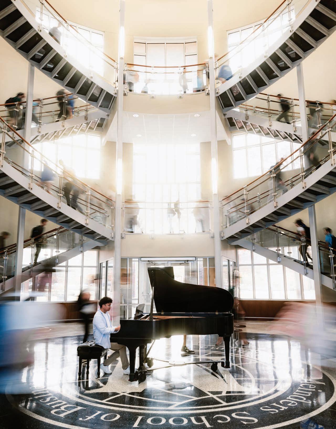 Meinders School of Business student Ernesto De Chavez, who completed his Bachelor of Business Administration at OCU and is now working on his Master of Science in Accounting, plays the piano in the rotunda of the Meinders building on campus, which is also featured on this page.