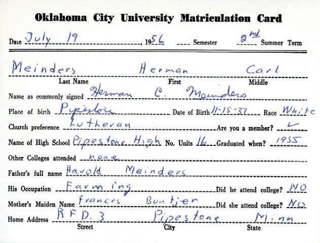 Following a brief visit, accompanied by his father, Meinders decided to take the leap and became an OCU student. He took early morning business classes so he could hold a job at a JCPenney store. He joined the Lamda Chi fraternity and made many friends.