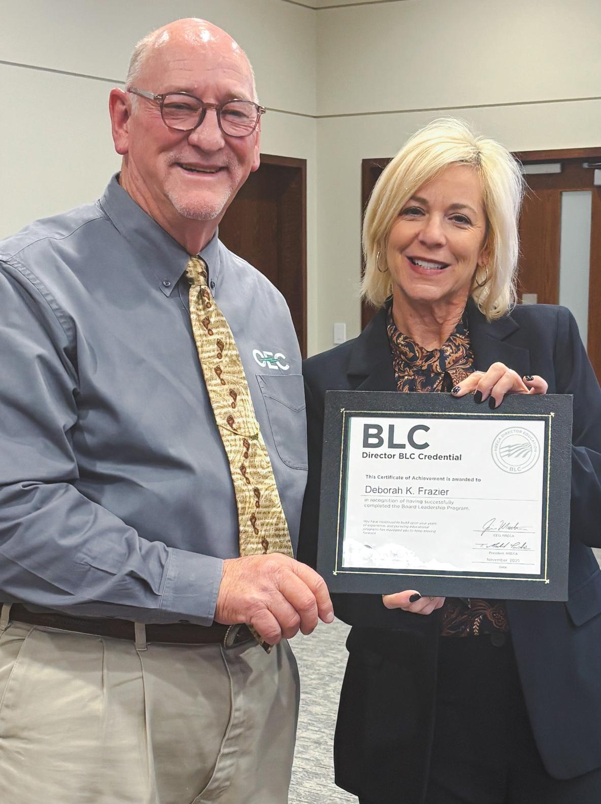 OEC Board Trustee Debbie Frazier recently earned her NRECA Board Leadership Certificate (BLC). This certificate is the second step in NRECA’s Director Education Program and demonstrates a director’s commitment to deeper learning in key areas of cooperative governance.