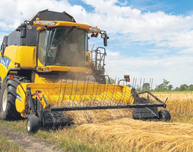 Mejetærskerens 30 fod brede skærbord er til formålet erstattet af en nyindkøbt pickup med korte bløde gummifingre. »Det er bare at sænke pick up’en, så går resten af sig selv. Tirsdag høstede vi 23 ton byg i timen med 18 pct. vand. Det går stærkt,« siger han.