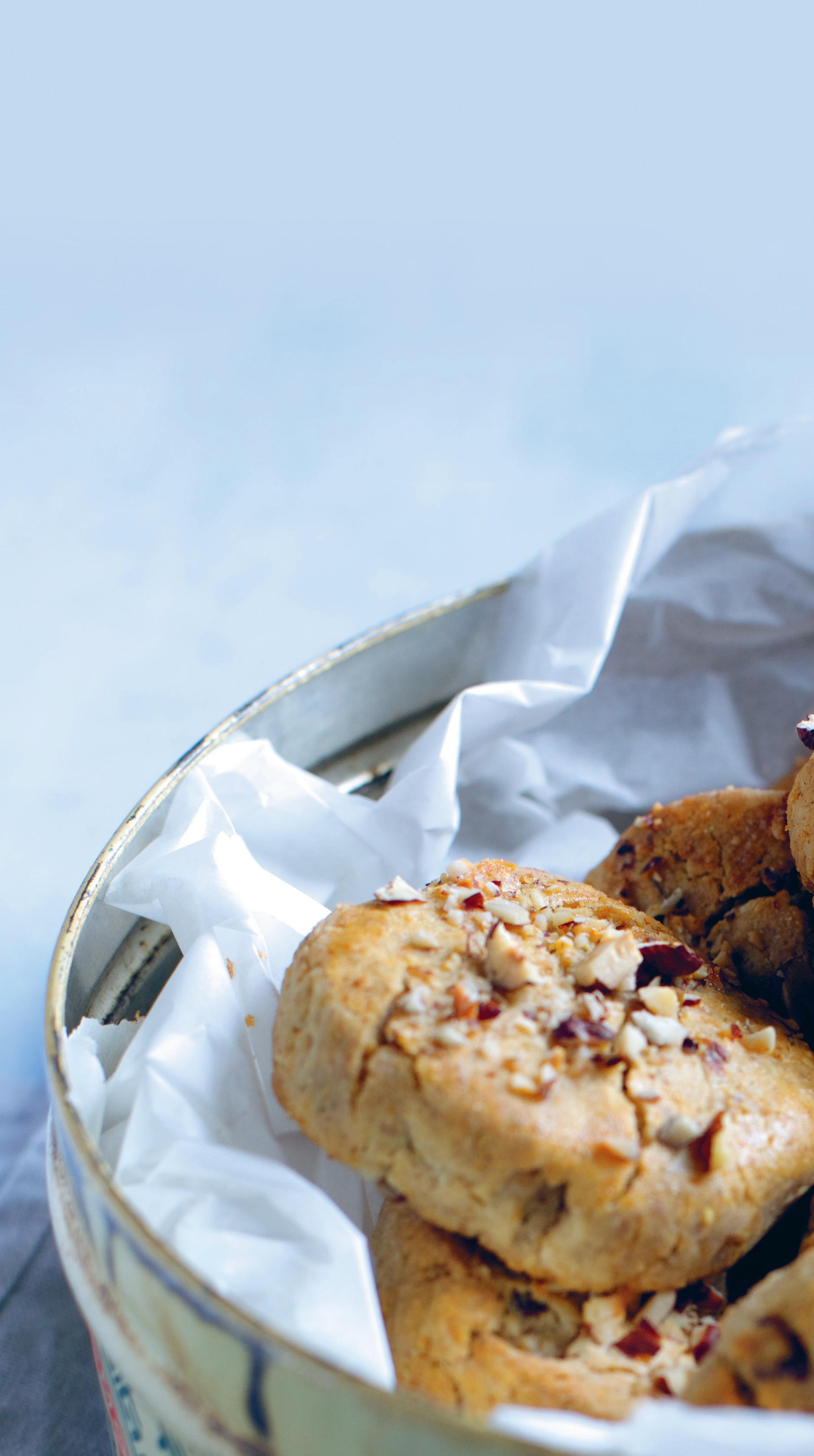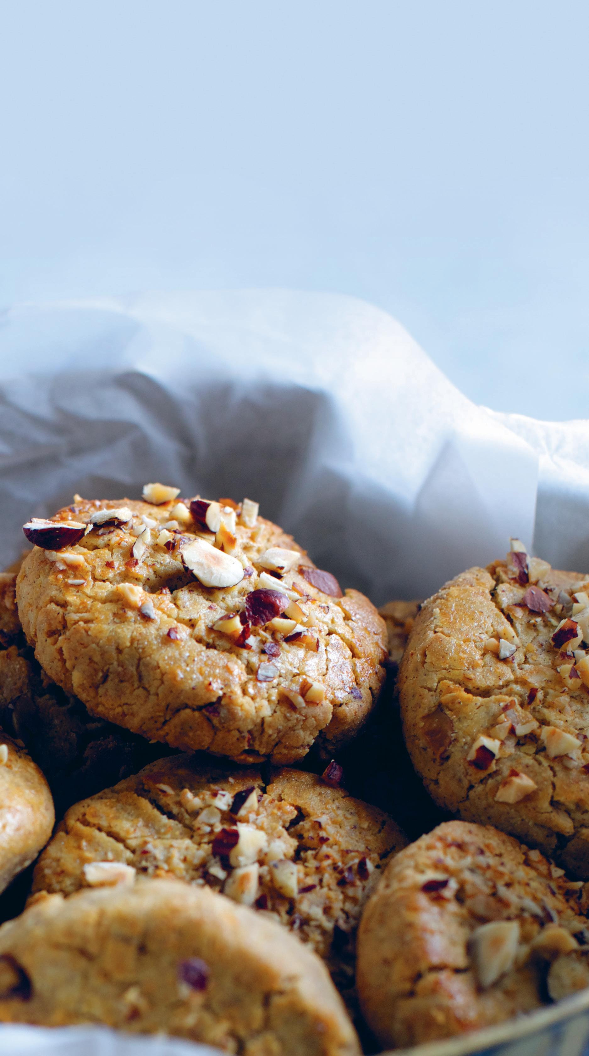 Tænd ovnen på 200°C. Bland rismel og quinoamel sammen i en skål. Smuldr det kolde smør i melblandingen. Pisk honning, mandelmælk og æg sammen. Hæld det i dejen sammen med bagepulver, salt og grofthakkede hasselnødder. Ælt dejen sammen og rul den til en aflang "pølse", som deles i 12 stykker. Form stykkerne