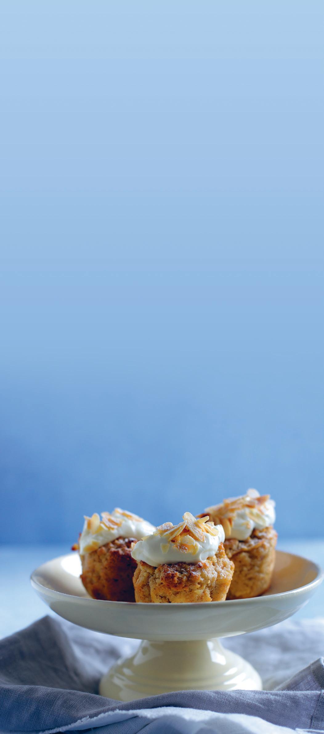 Bag kagerne i ovnen ved 200°C i ca. 30-35 minutter til de er gennembagte. Lad kagerne køle helt af inden servering. Stil dem gerne på køl i ca. 30 minutter, så de får en mere fast konsistens. Inden servering toppes kagerne med en skefuld drænet yoghurt, ristede mandelflager og et drys flomelis.
