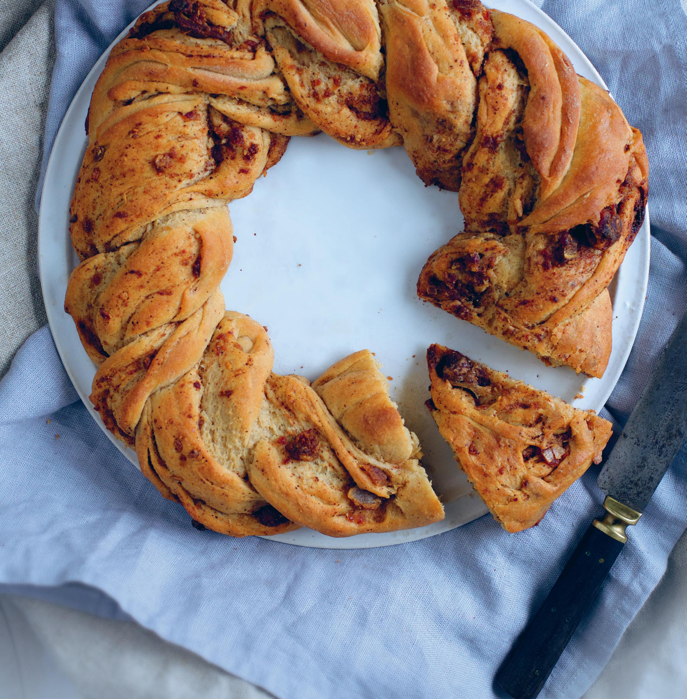 Kom kokosolie, kanel og dadler i en blender eller minihakker. Blend massen godt sammen. Når dejen er hævet, vendes den ud på et meldrysset bord. Rul dejen ud til en aflang firkant - ca. 25x50 cm. Smør remoncen ud på hele overfladen og rul dejen stramt sammen på den lange led til en ”pølse”. Placer ”pølsen” på en bageplade beklædt med bagepapir. Klip eller skær nu ned gennem dejen - på nær 2 cm i toppen. Dejen skal ligne et par bukser. Sno buksebenene sammen, og form den til en krans, hvor begge ender mødes. Bag brødet ved 200°C i ca. 20 minutter.
