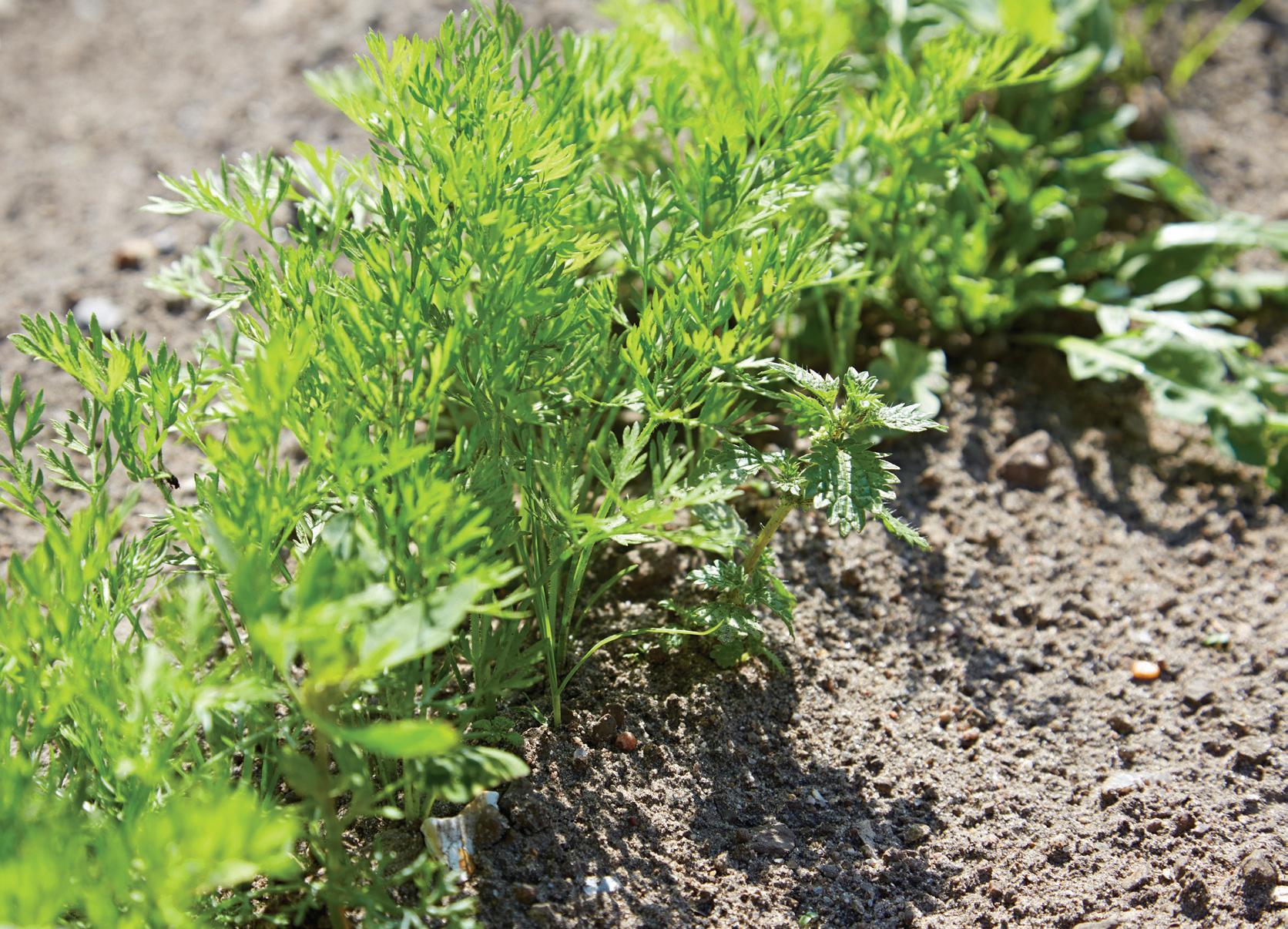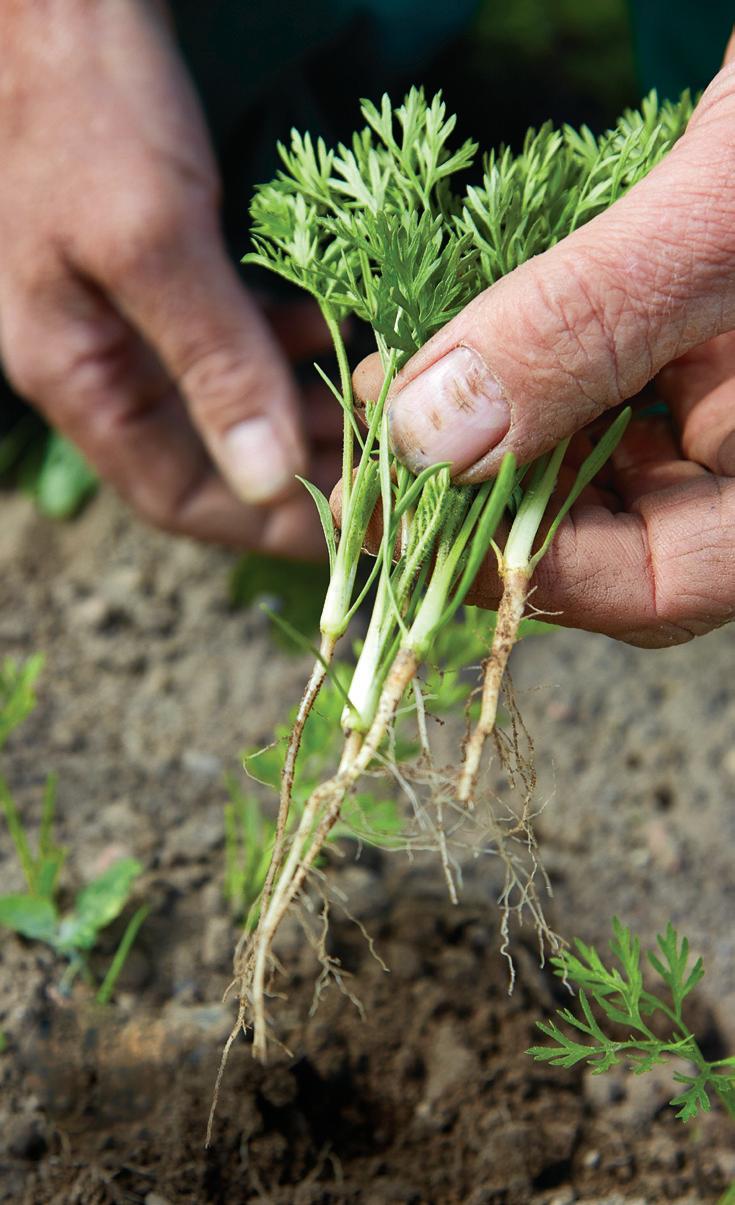 angreb nede i jorden, som kan finde sted, hvis der for eksempel kommer kulde og regn, efter at frøene er sået. Og hen i efteråret, når gulerødderne er blevet store, kører den konventionelle landmand typisk ud og sprøjter mod svamp for at holde toppene grønne og friske.