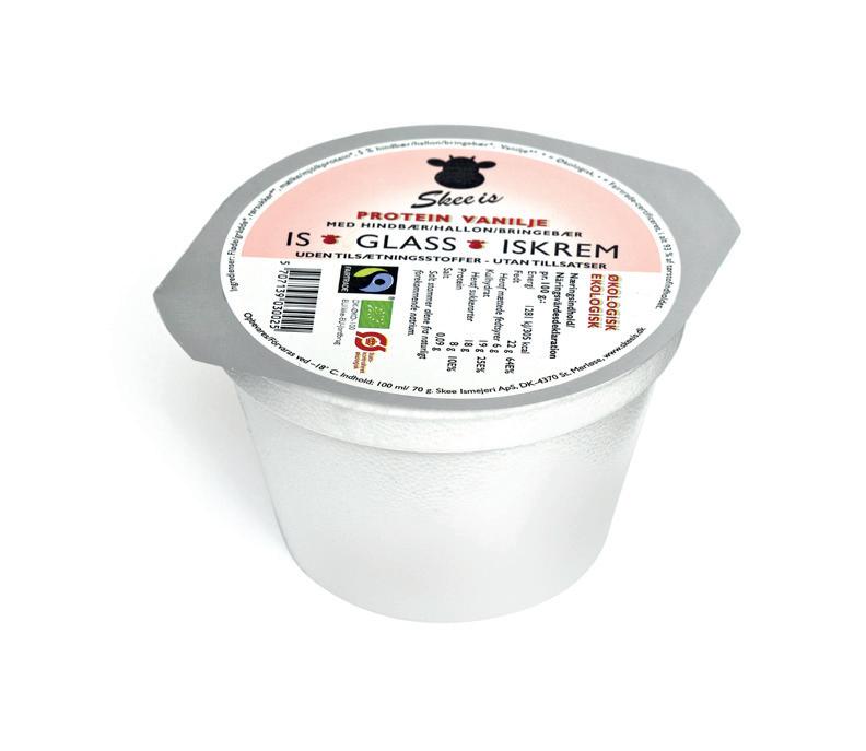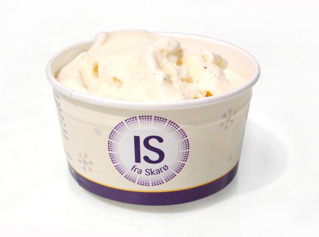 Produkter: Flere varianter af flødeis i bægre med 800 ml samt vanilje- og hindbær-ispinde.